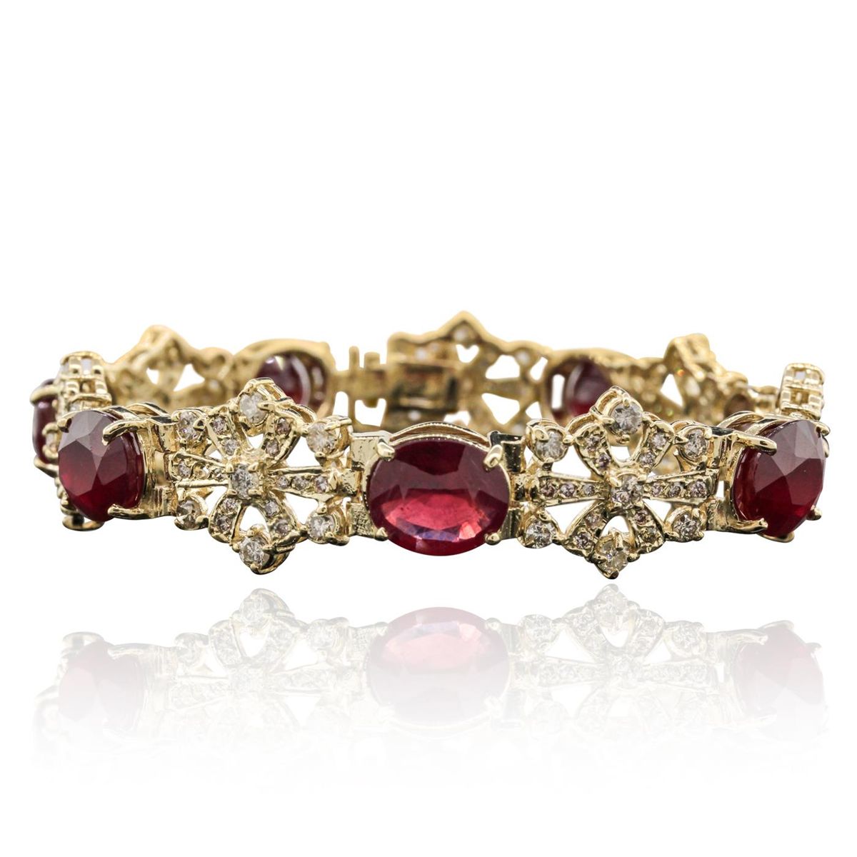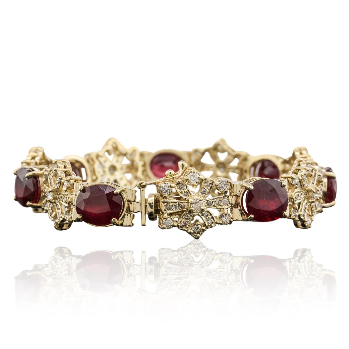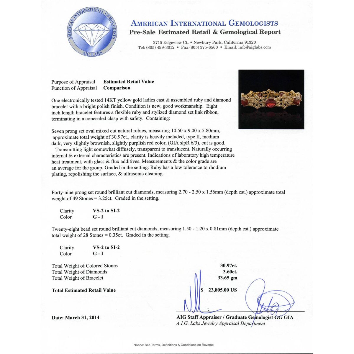 One electronically tested 14KT yellow gold ladies cast & assembled ruby and diamond bracelet with a bright polish finish. Condition is new, good workmanship. Eight inch length bracelet features a flexible ruby and stylized diamond set link ribbon, terminating in a concealed clasp with safety. Containing: Seven prong set oval mixed cut natural rubies, measuring 10.50 x 9.00 x 5.80mm, approximate. Total Weight of 30.97ct., clarity is heavily included, type II, medium dark, very slightly brownish, slightly purplish red color, (GIA slpR 6/3), cut is good. Transmitting light somewhat diffusely, transparent to translucent. Naturally occurring internal & external characteristics are present. Indications of laboratory high temperature heat treatment, with glass & flux additives. Measurements & the color grade are an average for the group. Graded in the setting. Ruby has a low tolerance to rhodium plating, repolishing the surface, & ultrasonic cleaning. Forty-Nine prong set round brilliant cut diamonds, measuring 2.70 - 2.50 x 1.56mm (depth est.) approximate. Total Weight of 49 Stones = 3.25ct. Graded in the setting. Clarity: VS-2 to SI-2. Color: G - I Twenty-Eight bead set round brilliant cut diamonds, measuring 1.50 - 1.20 x 0.81mm (depth est.) approximate. Total Weight of 28 Stones = 0.35ct. Graded in the setting. Clarity: VS-2 to SI-2. Color: G - I. Total Weight of Colored Stones 30.97ct. Total Weight of Diamonds 3.60ct. Total Weight of Bracelet 33.65 grams. AIG Appraised at $23,805.00.