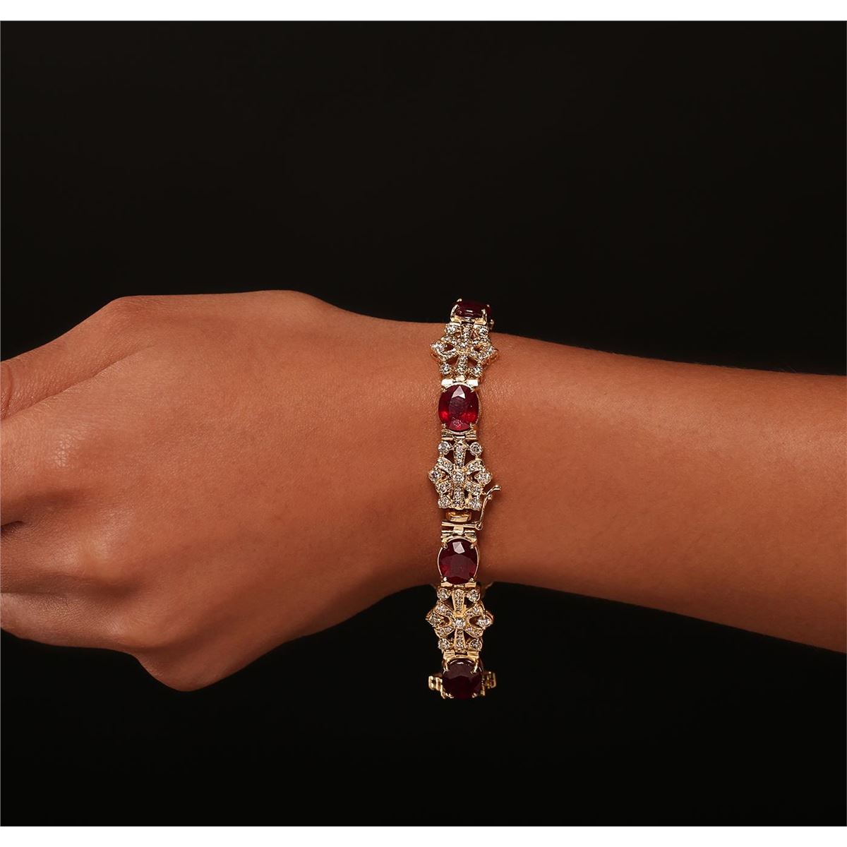 One electronically tested 14KT yellow gold ladies cast & assembled ruby and diamond bracelet with a bright polish finish. Condition is new, good workmanship. Eight inch length bracelet features a flexible ruby and stylized diamond set link ribbon, terminating in a concealed clasp with safety. Containing: Seven prong set oval mixed cut natural rubies, measuring 10.50 x 9.00 x 5.80mm, approximate. Total Weight of 30.97ct., clarity is heavily included, type II, medium dark, very slightly brownish, slightly purplish red color, (GIA slpR 6/3), cut is good. Transmitting light somewhat diffusely, transparent to translucent. Naturally occurring internal & external characteristics are present. Indications of laboratory high temperature heat treatment, with glass & flux additives. Measurements & the color grade are an average for the group. Graded in the setting. Ruby has a low tolerance to rhodium plating, repolishing the surface, & ultrasonic cleaning. Forty-Nine prong set round brilliant cut diamonds, measuring 2.70 - 2.50 x 1.56mm (depth est.) approximate. Total Weight of 49 Stones = 3.25ct. Graded in the setting. Clarity: VS-2 to SI-2. Color: G - I Twenty-Eight bead set round brilliant cut diamonds, measuring 1.50 - 1.20 x 0.81mm (depth est.) approximate. Total Weight of 28 Stones = 0.35ct. Graded in the setting. Clarity: VS-2 to SI-2. Color: G - I. Total Weight of Colored Stones 30.97ct. Total Weight of Diamonds 3.60ct. Total Weight of Bracelet 33.65 grams. AIG Appraised at $23,805.00.