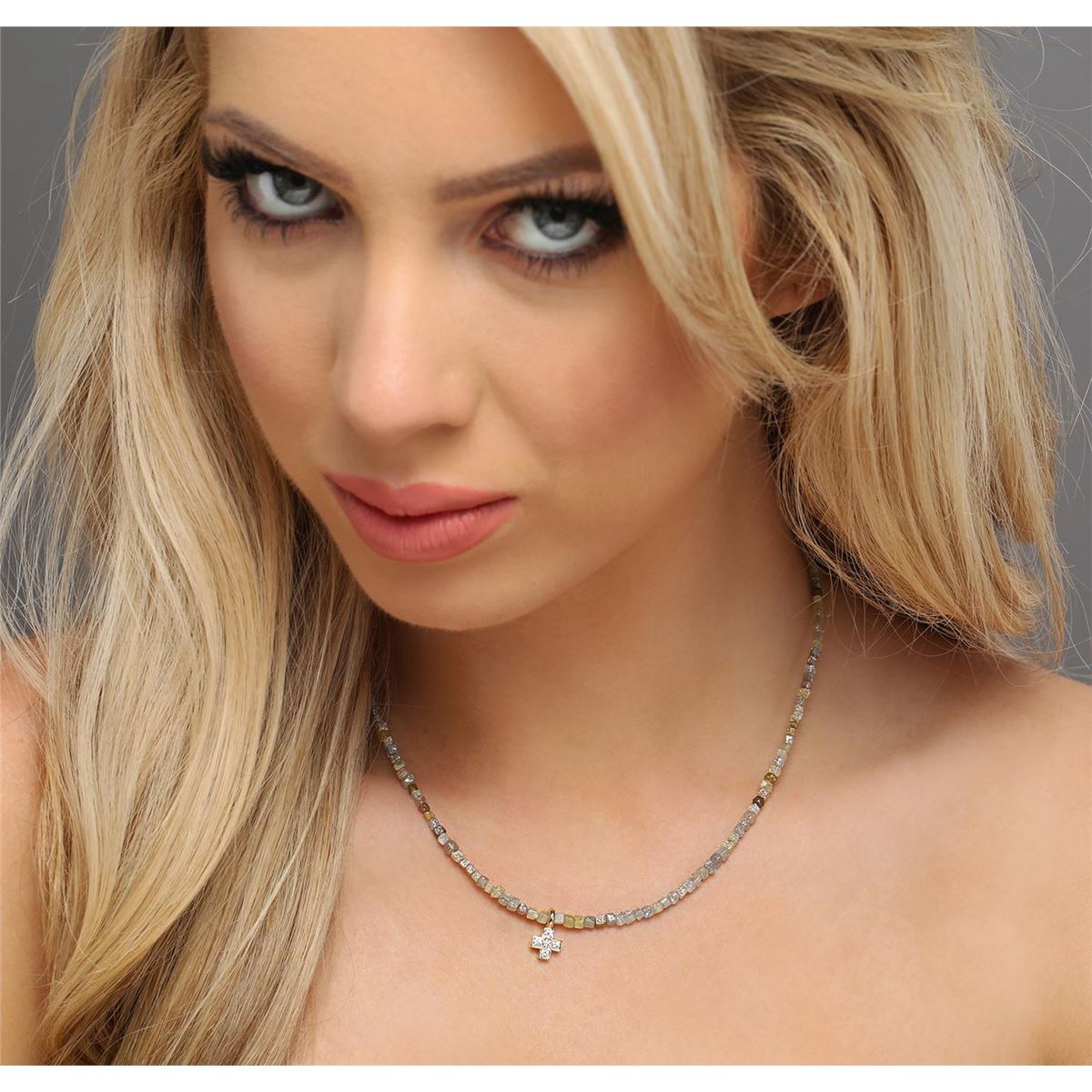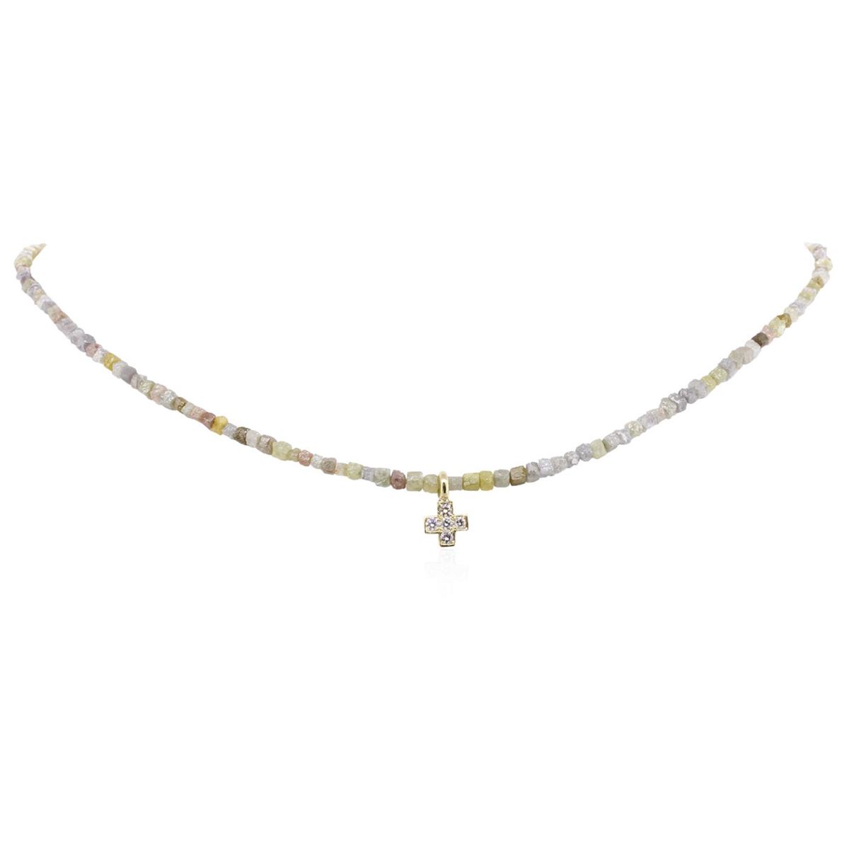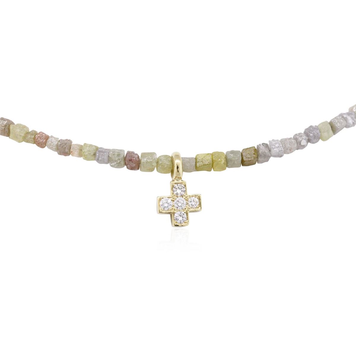 One necklace featuring: 14KT yellow gold weighing 8.10 grams containing rough diamonds with a total weight of 32.61cts and a cross charm containing pave set round cut diamonds with a total weight of 0.25cts.