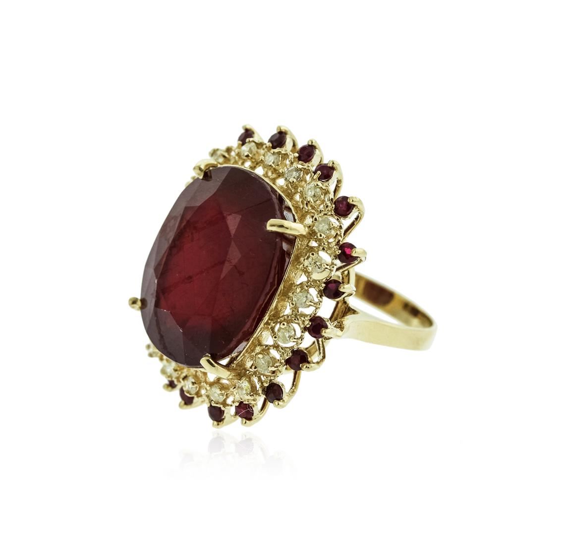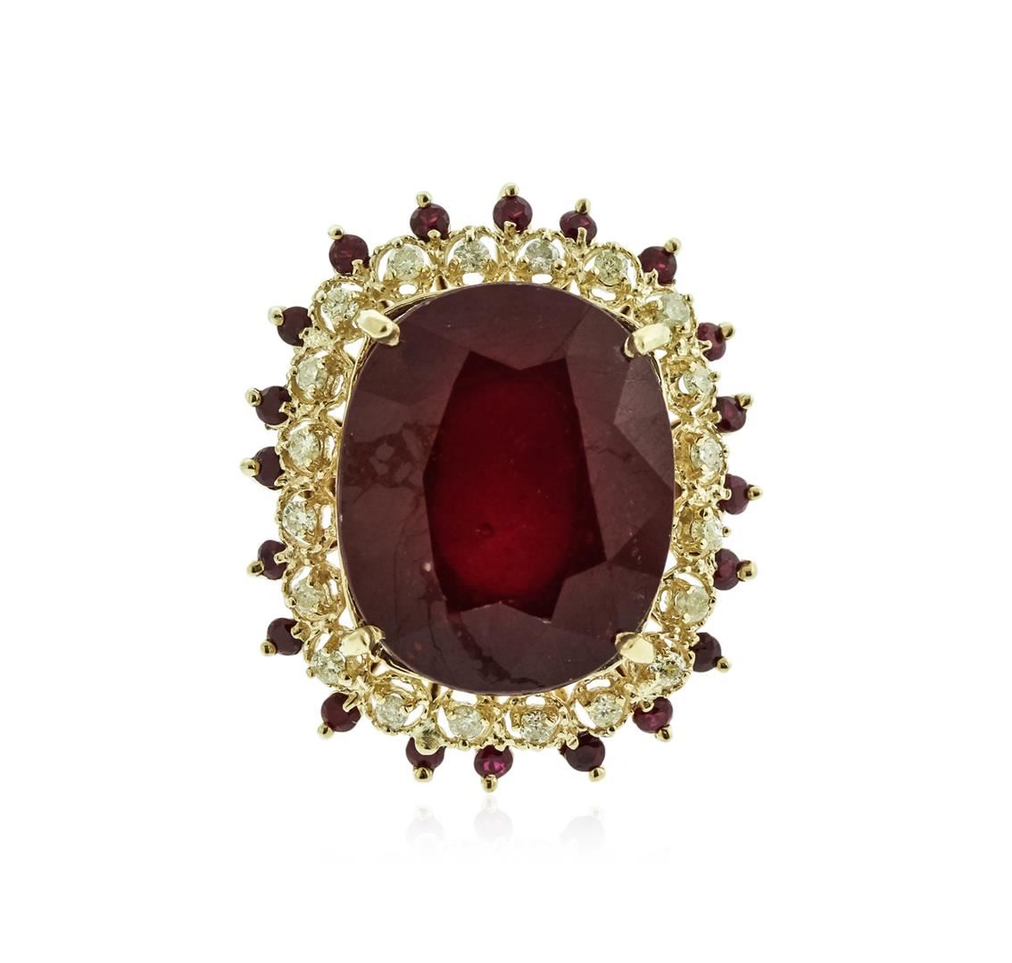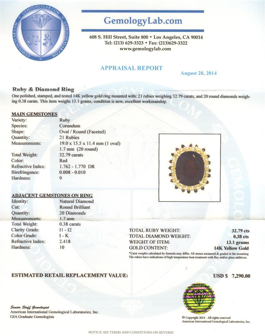 One polished, stamped, and tested 14KT yellow gold ring mounted with: 21 rubies weighing 32.79 carats, and 20 round diamonds weighing 0.38 carats. This item weighs 13.1 grams, condition is new, excellent workmanship. AIGL Appraised at $7,290.00.