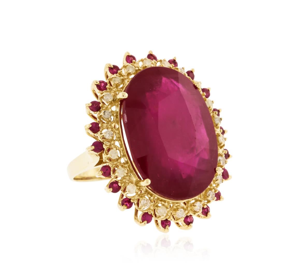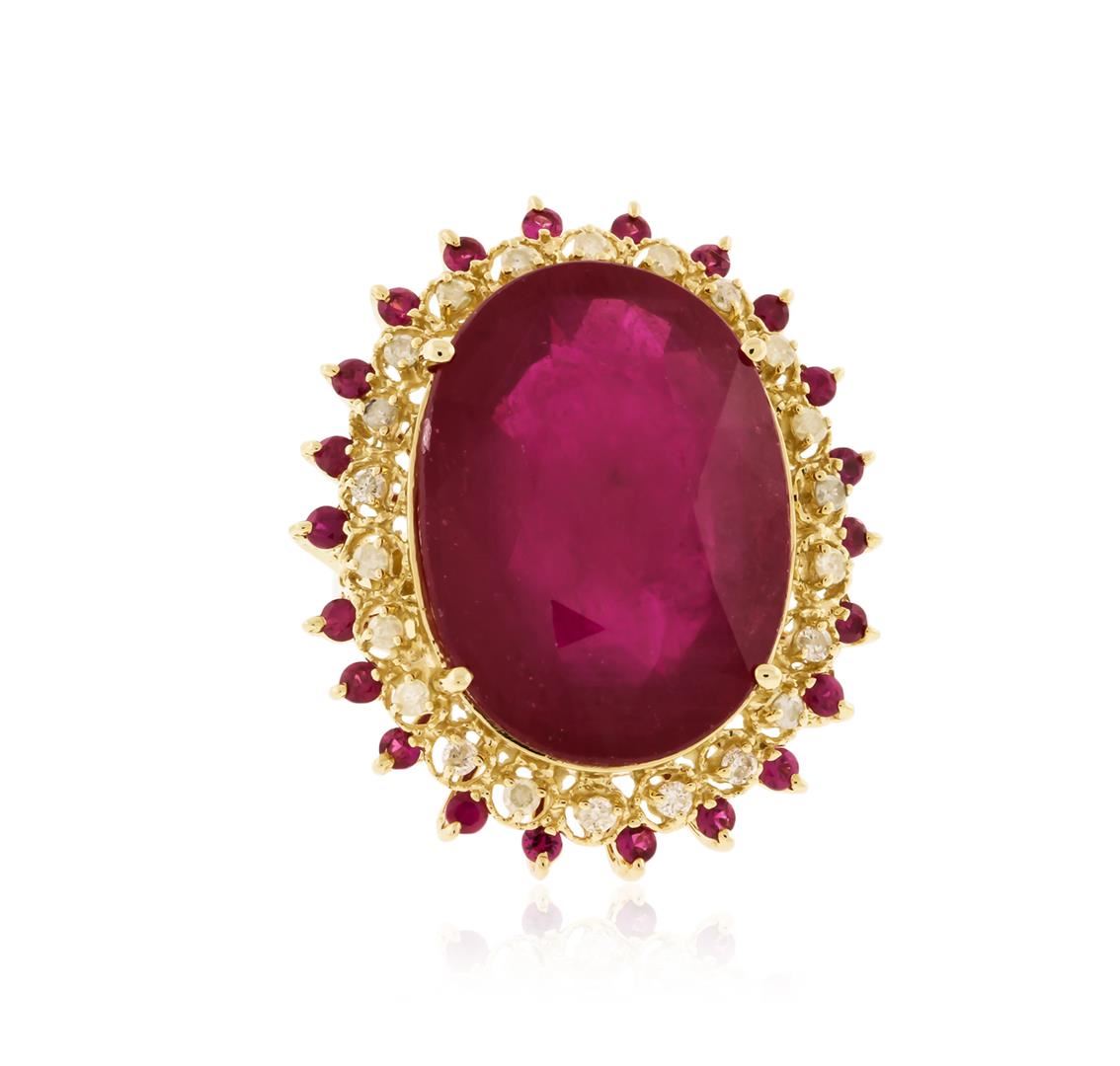 One electronically tested 14KT yellow gold ladies cast ruby and diamond ring with a bright and patterned finish. The featured ruby is set within a ruby and diamond gallery, completed by a two and one-half millimeter wide band. Identified with markings of "K14". Condition is new, good workmanship. Containing: One prong set oval mixed cut natural ruby, measuring 23.25 x 17.00 x 8.30mm, 8%. bulge factor, approximate weight of 32.60ct. with a strong Red fluorescence, clarity is heavily included, type II, medium dark, moderately strong, slightly purplish red color, (GIA slpR 6/4), cut is good. Transmitting light somewhat diffusely, transparent to translucent. Naturally occurring internal & external characteristics are present. Indications of laboratory high temperature heat treatment, with glass & flux additives. Colored Stone Grading Report attached. Graded in the setting. Twenty-two prong set round brilliant cut natural rubies, measuring 2.00 - 1.90 x 1.27 mm, approximate total weight of 0.84ct., clarity is slightly included, type II, medium dark, moderately strong, slightly purplish red color, (GIA slpR 6/4), cut is good. Transmitting light somewhat diffusely, transparent to translucent. Naturally occurring internal & external characteristics are present. Indications of laboratory high temperature heat treatment, with glass & flux additives. Color grade is an average for the group. Graded in the setting. Ruby has a low tolerance to rhodium plating, repolishing the surface, & ultrasonic cleaning. Twenty-Two prong set round brilliant cut diamonds, measuring 1.70 - 1.70 x 1.02mm (depth est.) approximate total weight of 22 Stones = 0.43ct. Graded in the setting. Clarity: I-1 to I-3. Color: H - J. Total Weight of Colored Stones 33.44ct. Total Weight of Diamonds 0.43ct. Total Weight of Ring 14.70 grams. AIG Appraised at $11,210.00.