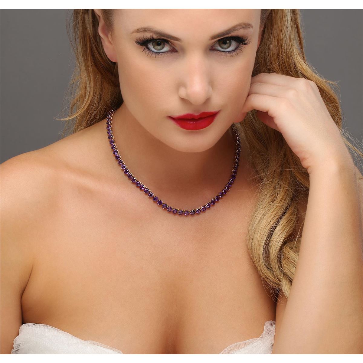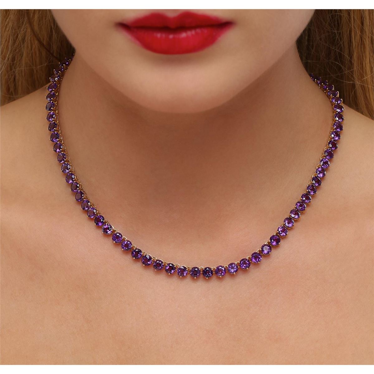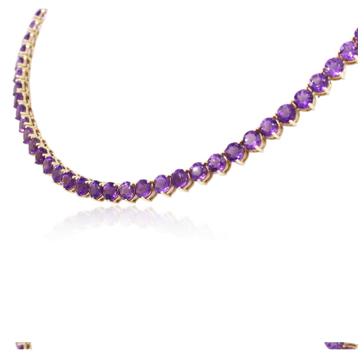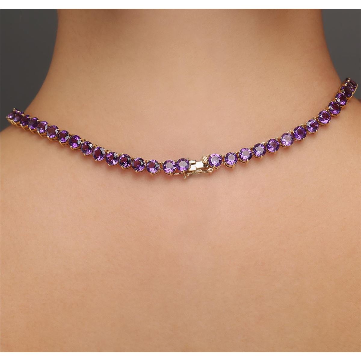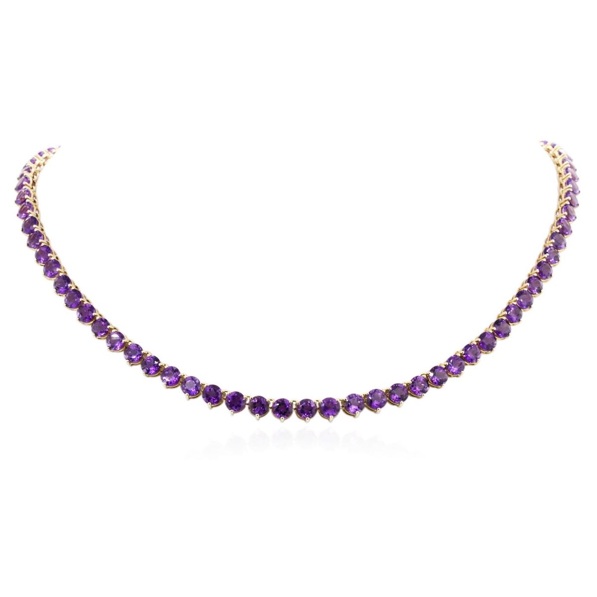 One electronically tested 14KT yellow gold ladies combination cast & assembled amethyst necklace with a hidden box clasp with a bright polish finish. Measurements: 17" in length Identified with markings of "14K". Condition is new. Containing: Eighty prong set round modified brilliant cut natural amethysts, measuring 5.00 - 4.70 x 3.15 mm, approximate total weight of 33.60ct., clarity is eye clean, type II, medium, moderately strong, purple color, (GIA P 5/4), cut is good. Colored gemstones are presumed to have been subjected to commonly used enhancement processes. All colored gemstones are graded in the mounting, unless otherwise stated. Total Weight of Colored Stones 33.60ct. Total Weight of Necklace 28.10 grams. GGL Appraised at $4,685.00.