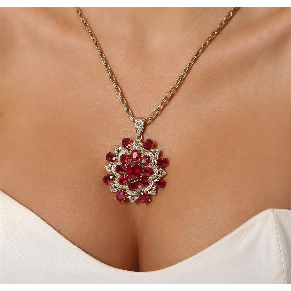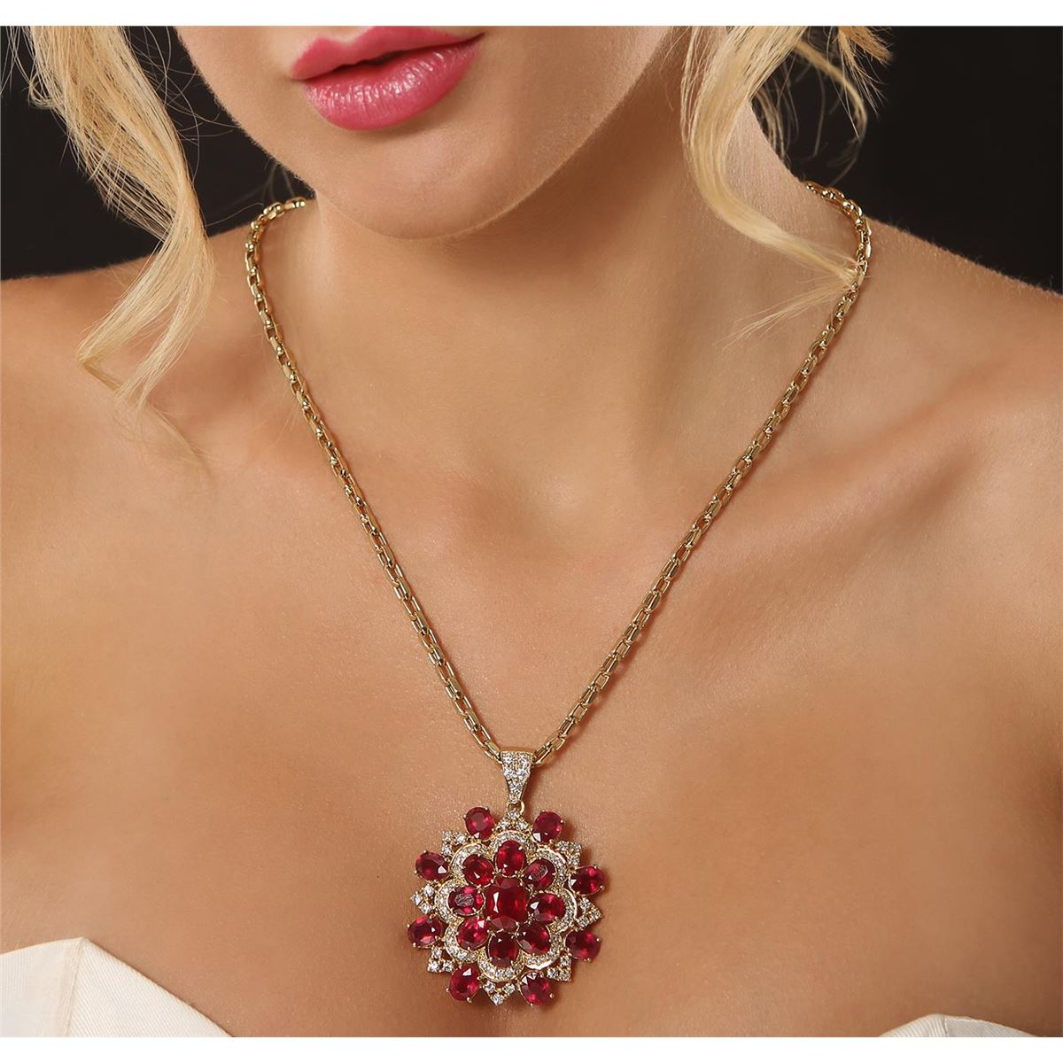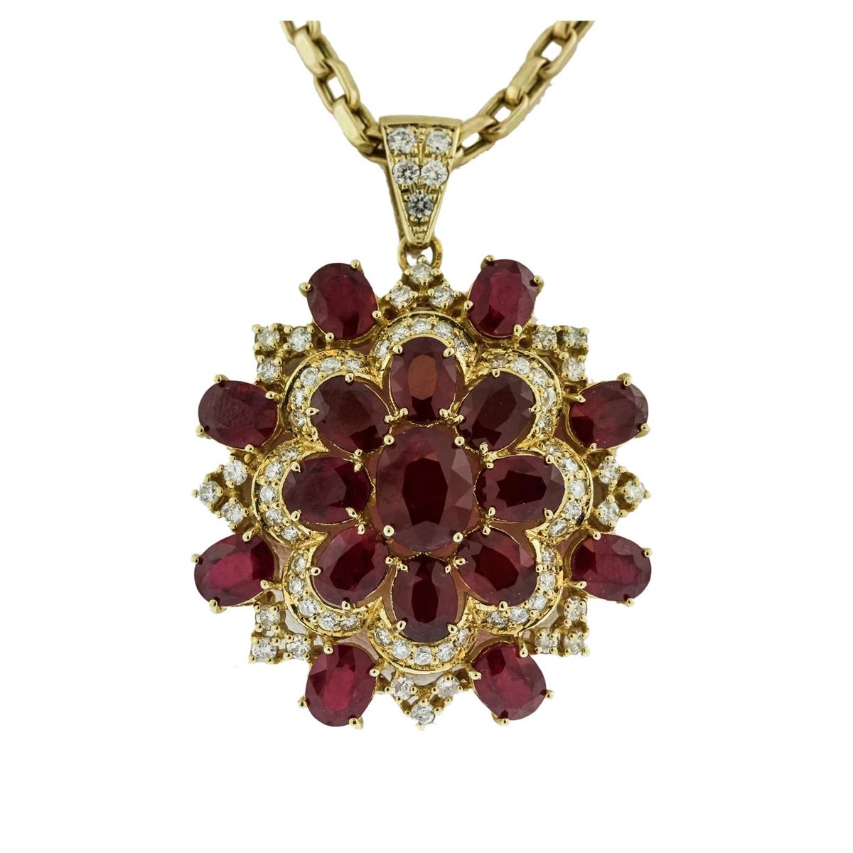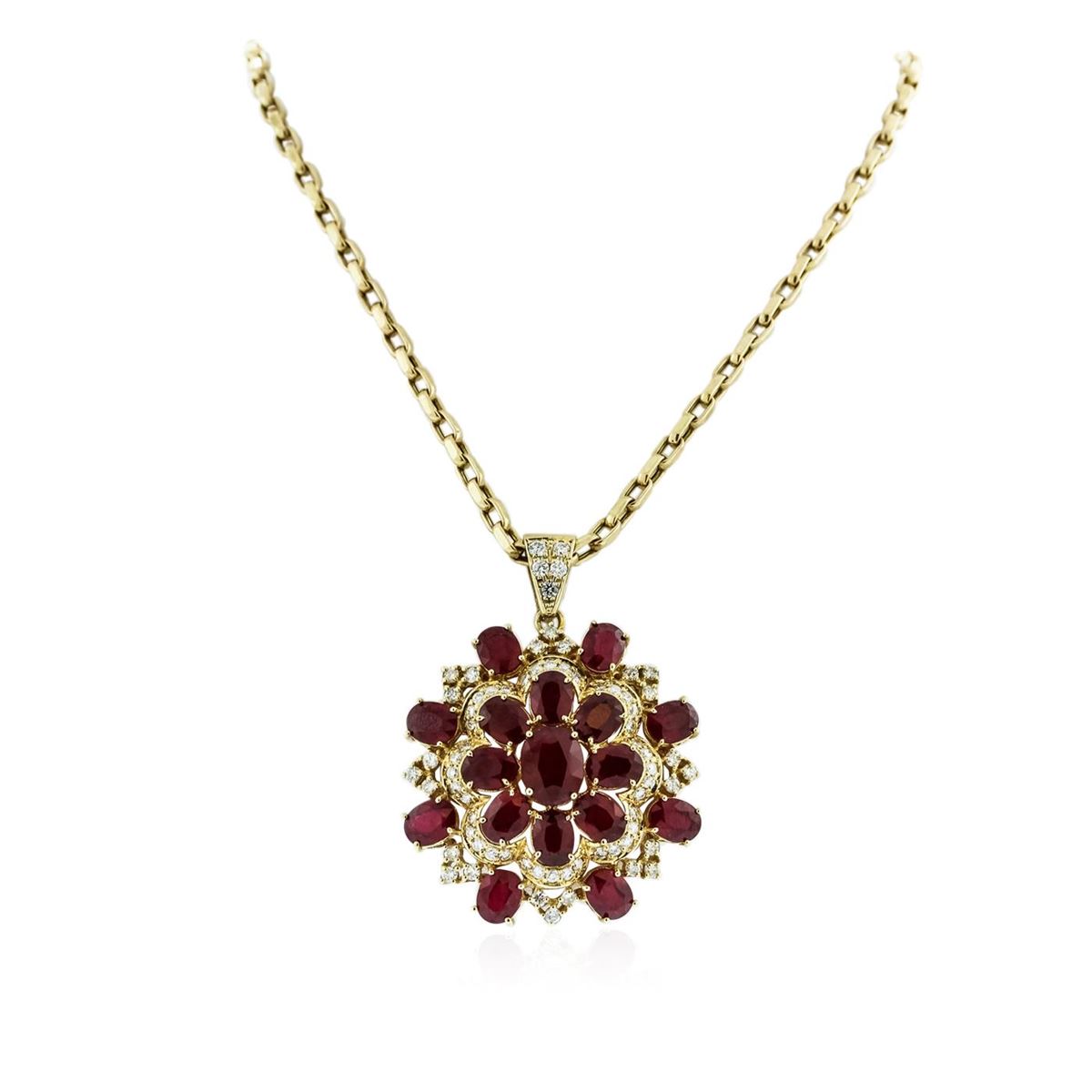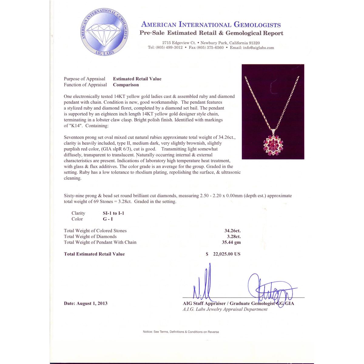 One electronically tested 14KT yellow gold ladies cast & assembled ruby and diamond pendant with chain. Condition is new, good workmanship. The pendant features a stylized ruby and diamond floret, completed by a diamond set bail. The pendant is supported by an eighteen inch length 14KT yellow gold designer style chain, terminating in a lobster claw clasp. Bright polish finish. Identified with markings of "K14". Containing: Seventeen prong set oval mixed cut natural rubies approximate total weight of 34.26ct., clarity is heavily included, type II, medium dark, very slightly brownish, slightly purplish red color, (GIA slpR 6/3), cut is good. Transmitting light somewhat diffusely, transparent to translucent. Naturally occurring internal & external characteristics are present. Indications of laboratory high temperature heat treatment, with glass & flux additives. The color grade is an average for the group. Graded in the setting. Ruby has a low tolerance to rhodium plating, repolishing the surface, & ultrasonic cleaning. Sixty-nine prong & bead set round brilliant cut diamonds, measuring 2.50 - 2.20 x 0.00mm (depth est.) approximate total weight of 69 Stones = 3.28ct. Graded in the setting. Clarity SI-1 to I-1. Color G - I. Total Weight of Colored Stones 34.26ct. Total Weight of Diamonds 3.28ct. Total Weight of Pendant With Chain 35.44gm. AIG Appraised at $22,025.00.