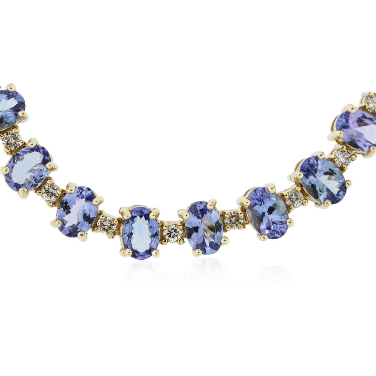 One electronically tested 14KT yellow gold Ladies combination cast & assembled necklace with a hidden box clasp with a high polish finish. Condition is new. Measurements: 17.50" in length. Identified with markings of "14K". Containing: Fifty-four prong set oval modified mixed cut natural tanzanites, measuring 7.10 x 5.30 x 2.50mm, approximate. Total Weight of 34.56ct., clarity is eye clean, type I, medium light, very slightly grayish, violet color, (GIA V 4/3), cut is good. Colored gemstones are presumed to have been subjected to commonly used color/clarity enhancement processes. Fifty-Five prong set round brilliant cut diamonds, measuring 2.50 - 2.50 x 1.50mm (depth est.) approximate. Total Weight of 55 Stones = 3.14ct. Clarity: SI-1 to SI-2. Color: I - J, Cut is Good. Total Weight of Colored Stones 34.56ct. Total Weight of Diamonds 3.14ct. Total Weight of Necklace 44.60 grams. GGL Appraised at $42,525.00.