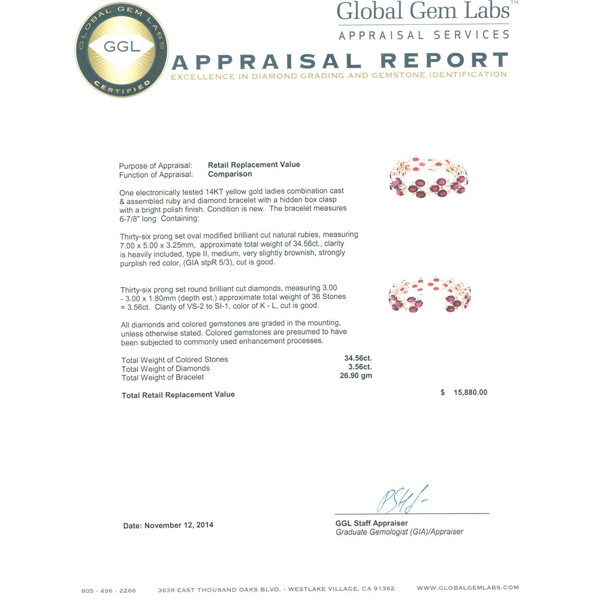One electronically tested 14KT yellow gold ladies combination cast & assembled ruby and diamond bracelet with a hidden box clasp with a bright polish finish. The bracelet measures 6-7/8" long Condition is new. Containing: Thirty-six prong set oval modified brilliant cut natural rubies, measuring 7.00 x 5.00 x 3.25mm, approximate total weight of 34.56ct., clarity is heavily included, type II, medium, very slightly brownish, strongly purplish red color, (GIA stpR 5/3), cut is good. Thirty-Six prong set round brilliant cut diamonds, measuring 3.00 - 3.00 x 1.80mm (depth est.) approximate total weight of 36 Stones = 3.56ct. Clarity: VS-2 to SI-1. Color: K - L, Cut is Good. All diamonds and colored gemstones are graded in the mounting, unless otherwise stated. Colored gemstones are presumed to have been subjected to commonly used enhancement processes. Total Weight of Colored Stones 34.56ct. Total Weight of Diamonds 3.56ct. Total Weight of Bracelet 26.90 grams. GGL Appraised at $15,880.00.