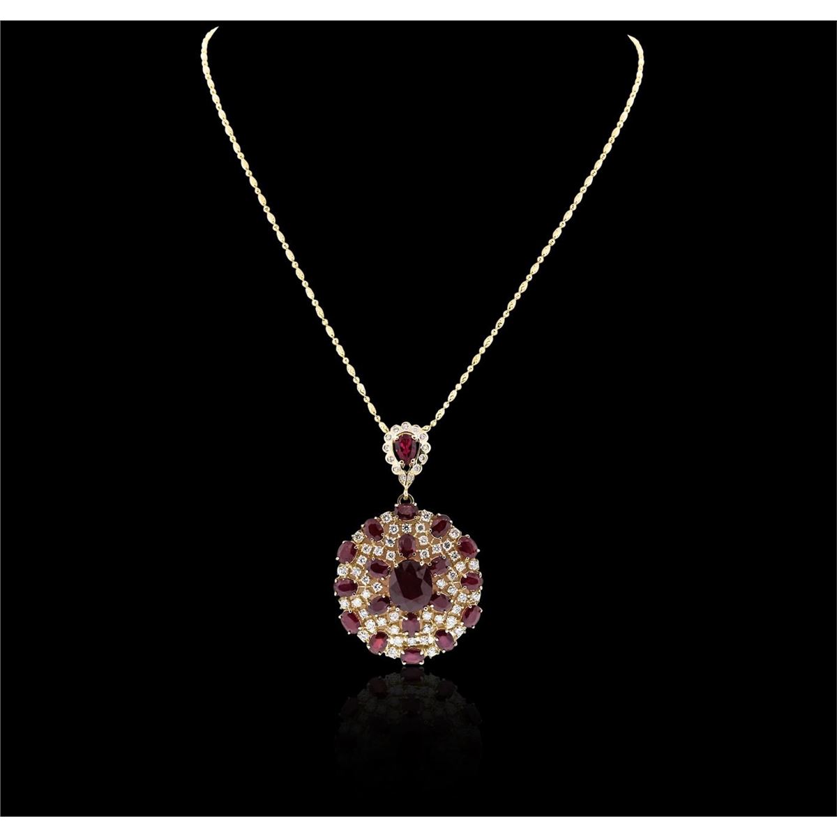 One electronically tested 14KT yellow gold ladies combination cast & assembled ruby and diamond pendant & chain 20.0" long,  fancy link with a lobster claw clasp with a bright polish finish.   Identified with markings of "14K". Condition is new. Containing: One prong set oval modified brilliant cut natural ruby, measuring 14.71 x 12.60 x 8.19mm,  approximate weight of 12.75ct., clarity is heavily included, type II, dark, moderately strong, strongly purplish red color, (GIA stpR 7/4), cut is good.  One prong set pear modified brilliant cut natural ruby, measuring 9.17 x 6.25 x 4.06mm,  approximate weight of 1.86ct., clarity is moderately included, type II, medium, moderately strong, strongly purplish red color, (GIA stpR 5/4), cut is good.  Eighteen prong set oval modified brilliant cut natural rubies, measuring 7.00 x 5.00 x 3.87mm,  approximate total weight of 20.52ct., clarity is heavily included, type II, medium dark, moderately strong, strongly purplish red color, (GIA stpR 6/4), cut is good.  Forty-Eight prong set round brilliant cut diamonds, measuring 2.80 - 2.80 x 1.68mm (depth est.) approximate total weight of 48 Stones = 3.85ct.  Clarity of SI-2 to I-2, Color of K - L, Cut is Good.   Twelve prong set round brilliant cut diamonds, measuring 1.50 - 1.50 x 0.90mm (depth est.) approximate total weight of 12 Stones = 0.15ct.  Clarity of I-1 to I-2, Color of K - L, Cut is Good.  All diamonds and colored gemstones are graded in the mounting, unless otherwise stated. Colored gemstones are presumed to have been subjected to commonly used enhancement processes. Total Weight of Colored Stones 35.13 ct. Total Weight of Diamonds  4.00 ct. Total Weight of Pendant & Chain 34.00 grams. GGL Appraised at $19,190.00.
