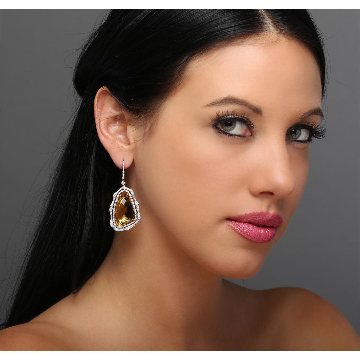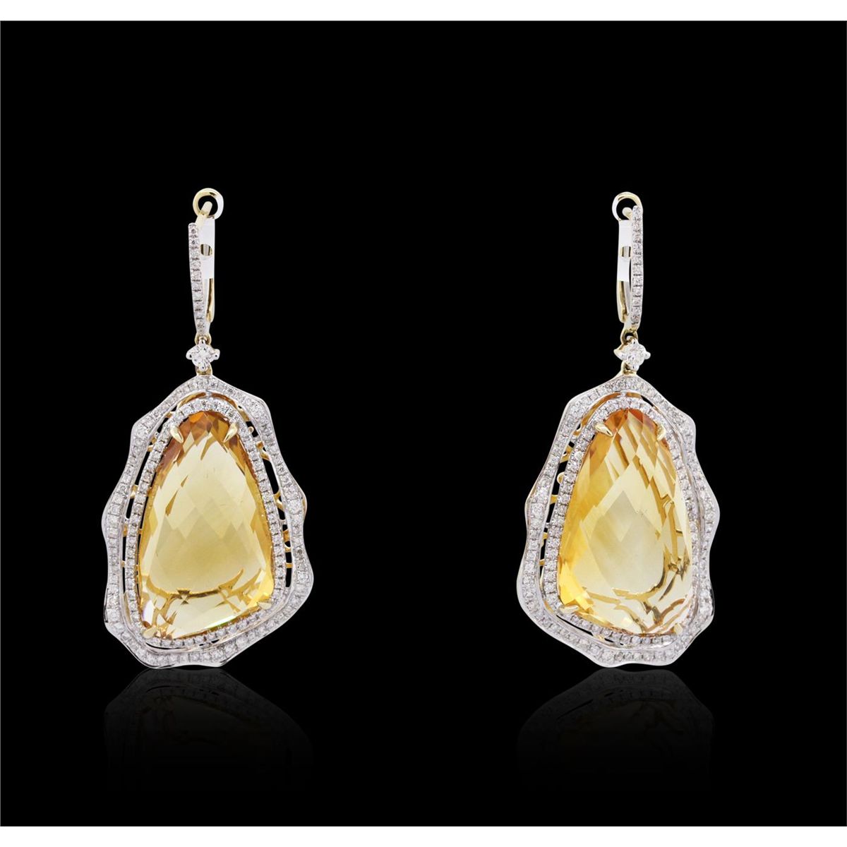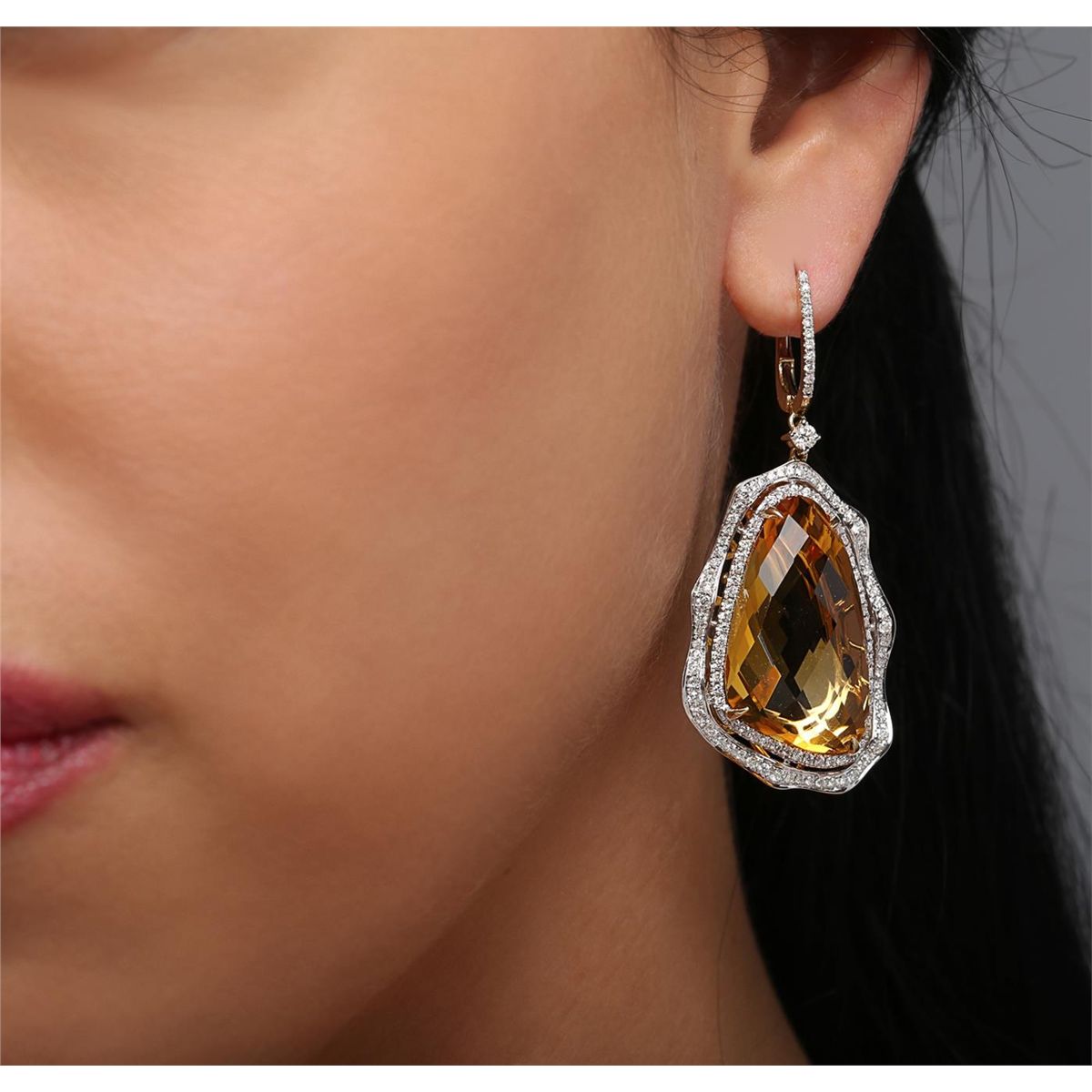 One polished, stamped, and tested pair of 14KT yellow gold Michael Christoff designer earrings mounted with: 2 genuine citrine center stones weighing 35.28ct, and 264 genuine diamonds weighing 1.46ct. This item weighs 17.10 grams, condition is new, excell