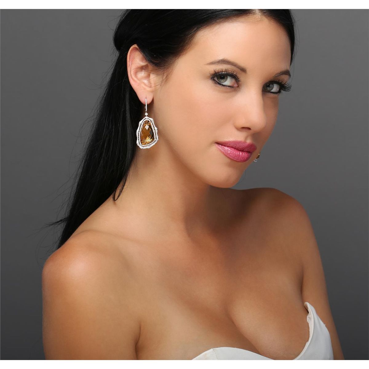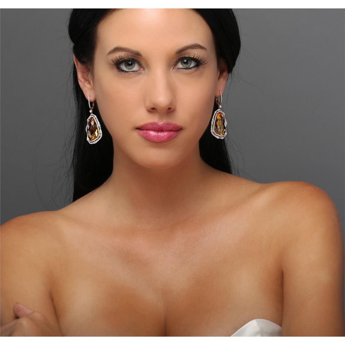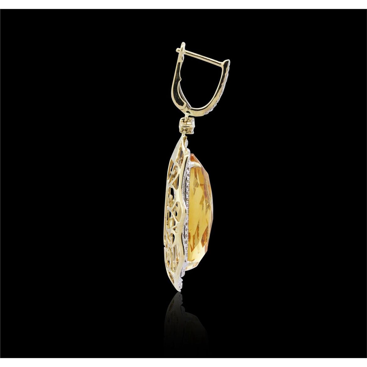 One polished, stamped, and tested pair of 14KT yellow gold Michael Christoff designer earrings mounted with: 2 genuine citrine center stones weighing 35.28ct, and 264 genuine diamonds weighing 1.46ct. This item weighs 17.10 grams, condition is new, excell