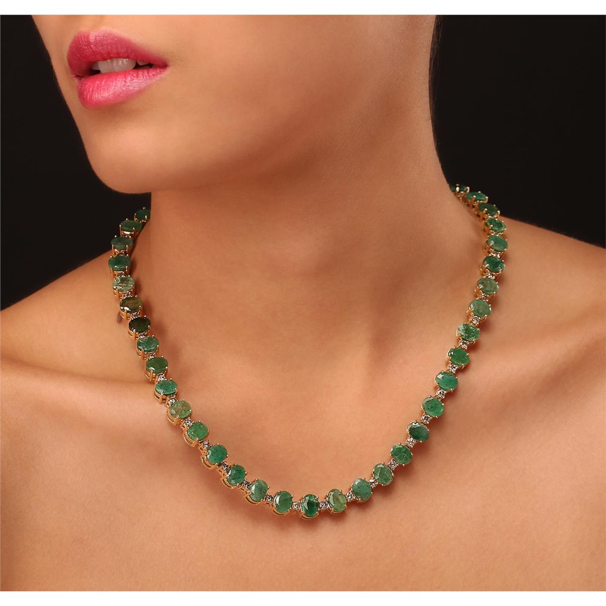 One electronically tested 14KT yellow gold ladies cast & assembled emerald and diamond necklace. Condition is new, good workmanship. Seventeen and three-quarter inch length bracelet features a flexible ribbon of emeralds alternated by diamonds terminating in a concealed clasp with safety bar. Identified with markings of "14K". Containing: Forty-six prong set oval mixed cut natural emeralds, measuring 7.00 x 5.50 x 3.58mm, 6%. bulge factor, approximate. Total Weight of 37.26ct., clarity is severely included, type III, medium, very slightly grayish, very slightly bluish green color, (GIA vslbG 5/3), cut is good. Transmitting light somewhat diffusely, translucent. Naturally occurring internal & external characteristics are present. Indications of oil residue. Measurements & the color grade are an average for the group. Graded in the setting. Forty-Six prong set round brilliant cut diamonds, measuring 2.70 - 2.60 x 1.59mm (depth est.) approximate. Total Weight of 46 Stones = 3.23ct. Color grade is an average for the group. Graded in the setting. Clarity: I-1 to I-3. Total Weight of Colored Stones 37.26ct. Total Weight of Diamonds 3.23ct. Total Weight of Necklace 56.10 grams. AIG Appraised at $21,960.00.