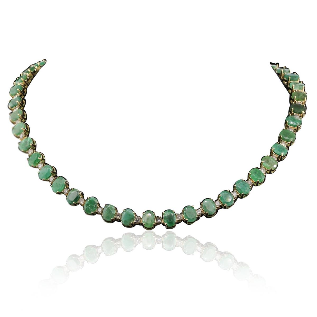 One electronically tested 14KT yellow gold ladies cast & assembled emerald and diamond necklace. Condition is new, good workmanship. Seventeen and three-quarter inch length bracelet features a flexible ribbon of emeralds alternated by diamonds terminating in a concealed clasp with safety bar. Identified with markings of "14K". Containing: Forty-six prong set oval mixed cut natural emeralds, measuring 7.00 x 5.50 x 3.58mm, 6%. bulge factor, approximate. Total Weight of 37.26ct., clarity is severely included, type III, medium, very slightly grayish, very slightly bluish green color, (GIA vslbG 5/3), cut is good. Transmitting light somewhat diffusely, translucent. Naturally occurring internal & external characteristics are present. Indications of oil residue. Measurements & the color grade are an average for the group. Graded in the setting. Forty-Six prong set round brilliant cut diamonds, measuring 2.70 - 2.60 x 1.59mm (depth est.) approximate. Total Weight of 46 Stones = 3.23ct. Color grade is an average for the group. Graded in the setting. Clarity: I-1 to I-3. Total Weight of Colored Stones 37.26ct. Total Weight of Diamonds 3.23ct. Total Weight of Necklace 56.10 grams. AIG Appraised at $21,960.00.