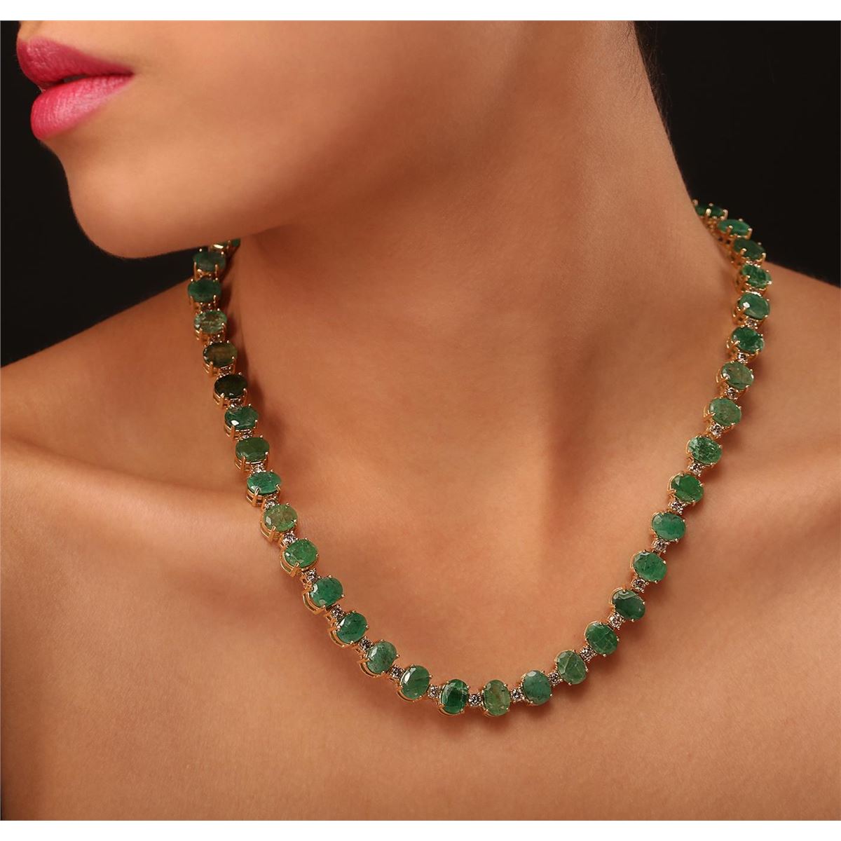 One electronically tested 14KT yellow gold ladies cast & assembled emerald and diamond necklace. Condition is new, good workmanship. Seventeen and three-quarter inch length bracelet features a flexible ribbon of emeralds alternated by diamonds terminating in a concealed clasp with safety bar. Identified with markings of "14K". Containing: Forty-six prong set oval mixed cut natural emeralds, measuring 7.00 x 5.50 x 3.58mm, 6%. bulge factor, approximate. Total Weight of 37.26ct., clarity is severely included, type III, medium, very slightly grayish, very slightly bluish green color, (GIA vslbG 5/3), cut is good. Transmitting light somewhat diffusely, translucent. Naturally occurring internal & external characteristics are present. Indications of oil residue. Measurements & the color grade are an average for the group. Graded in the setting. Forty-Six prong set round brilliant cut diamonds, measuring 2.70 - 2.60 x 1.59mm (depth est.) approximate. Total Weight of 46 Stones = 3.23ct. Color grade is an average for the group. Graded in the setting. Clarity: I-1 to I-3. Total Weight of Colored Stones 37.26ct. Total Weight of Diamonds 3.23ct. Total Weight of Necklace 56.10 grams. AIG Appraised at $21,960.00.