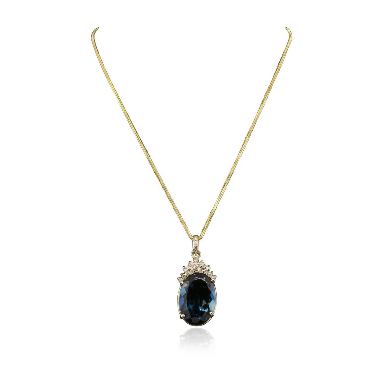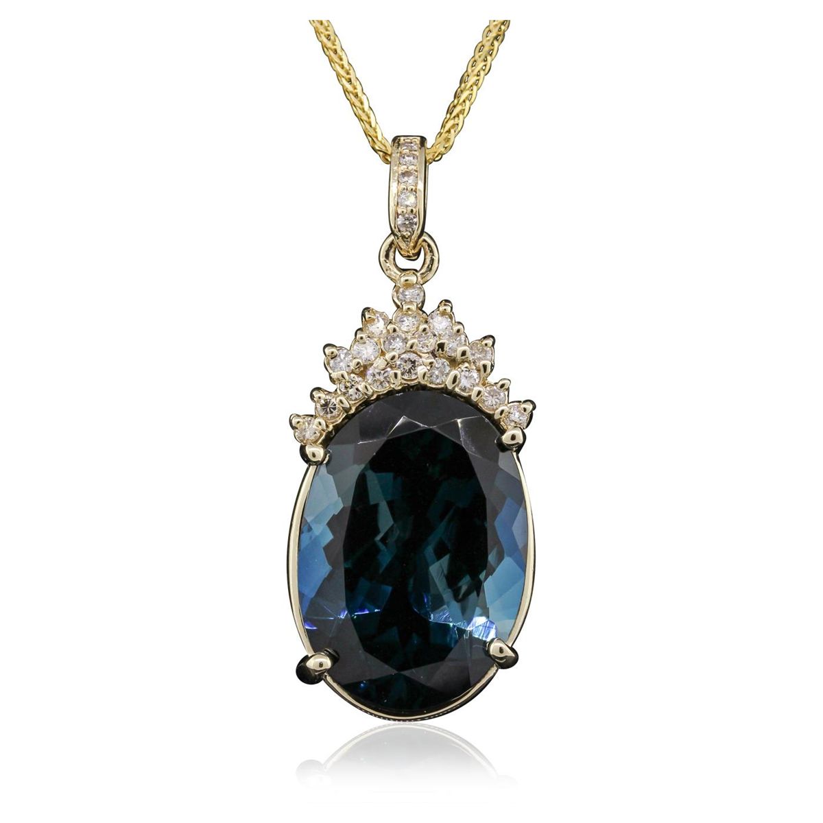 One electronically tested 14KT yellow gold ladies cast & assembled topaz and diamond pendant with chain. Condition is new, good workmanship. The featured blue topaz is accented by a stylized diamond cluster, completed by a diamond set bail. The pendant is supported by an eighteen inch length 14KT yellow gold designer style chain, terminating in a lobster claw clasp. Bright polish finish. Containing: One prong set oval mixed cut natural blue topaz, measuring 25.00 x 18.00 x 10.75mm, 7%. bulge factor, approximate weight of 37.74ct., clarity is eye clean, type I, dark, very slightly grayish, greenish blue color, (GIA gB 7/3), cut is good. Transmitting light with no distortion, transparent. Graded in the setting. A deposit of a thin layer has been applied to the topaz to produce the intense color effect. The process utilizes a very high temperature treatment, diffusion of ions into the topaz, plus in some cases neutron bombardment has been used to create the color center. Diffusion processes causes the added ions to become part of the crystal surface with no distinct boundary. Do not put a gem treated in this manner into an ultrasonic cleaner. Twenty-Four prong set round brilliant cut diamonds, measuring 2.20 - 1.80 x 1.20mm (depth est.) approximate. Total Weight of 24 Stones = 0.81ct. Graded in the setting. Clarity: SI-1 to I-1. Color: G - I. Total Weight of Colored Stones 37.74ct. Total Weight of Diamonds 0.81ct. Total Weight of Pendant With Chain 20.17 grams. AIG Appraised at $5,965.00.