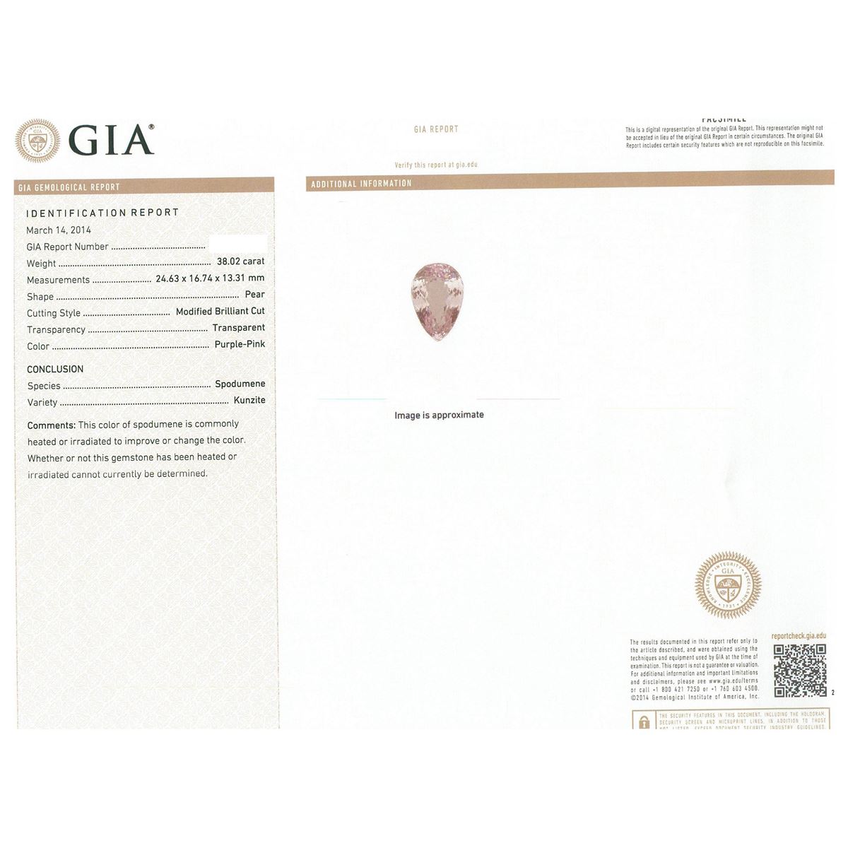 One electronically tested 14KT yellow gold ladies cast kunzite and diamond ring with a bright polish finish. Condition is new, good workmanship. The featured kunzite is set within a diamond bezel supported by split shoulders, completed by a two and one-half millimeter wide band. Identified with markings of "K14". Containing: One prong set pear modified brilliant cut natural kunzite, measuring 24.63 x 16.74 x 13.31mm, exact weight 38.02ct., type I Clarity is eye clean, medium, very slightly grayish, Purple-Pink, (GIA PPi 5/3), cut is good. Transmitting light with no distortion, transparent. GIA Gemological Report attached. Graded loose prior to setting in the GIA Laboratory, Report #2151952856.Twenty-Seven prong set round brilliant cut diamonds, measuring 2.50 - 2.40 x 1.47mm (depth est.) approximate. Total Weight of 27 Stones = 1.55ct. Graded in the setting. Clarity: SI-1 to I-1. Color: G - I. Total Weight of Colored Stones 38.02ct. Total Weight of Diamonds 1.55ct. Total Weight of Ring 17.09 grams. AIG Appraised at $17,565.00.