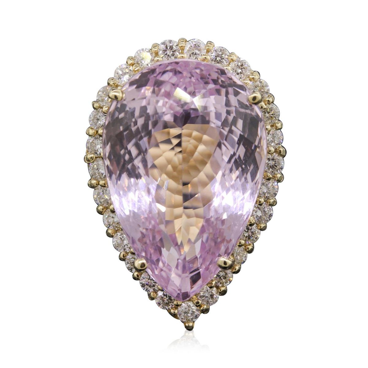 One electronically tested 14KT yellow gold ladies cast kunzite and diamond ring with a bright polish finish. Condition is new, good workmanship. The featured kunzite is set within a diamond bezel supported by split shoulders, completed by a two and one-half millimeter wide band. Identified with markings of "K14". Containing: One prong set pear modified brilliant cut natural kunzite, measuring 24.63 x 16.74 x 13.31mm, exact weight 38.02ct., type I Clarity is eye clean, medium, very slightly grayish, Purple-Pink, (GIA PPi 5/3), cut is good. Transmitting light with no distortion, transparent. GIA Gemological Report attached. Graded loose prior to setting in the GIA Laboratory, Report #2151952856.Twenty-Seven prong set round brilliant cut diamonds, measuring 2.50 - 2.40 x 1.47mm (depth est.) approximate. Total Weight of 27 Stones = 1.55ct. Graded in the setting. Clarity: SI-1 to I-1. Color: G - I. Total Weight of Colored Stones 38.02ct. Total Weight of Diamonds 1.55ct. Total Weight of Ring 17.09 grams. AIG Appraised at $17,565.00.
