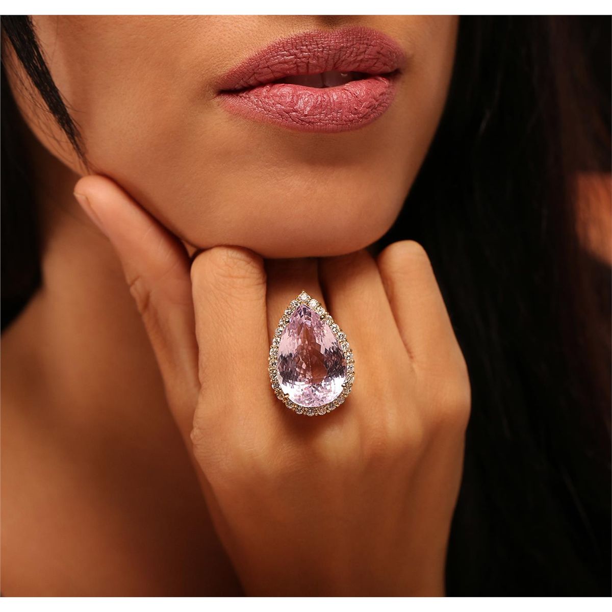 One electronically tested 14KT yellow gold ladies cast kunzite and diamond ring with a bright polish finish. Condition is new, good workmanship. The featured kunzite is set within a diamond bezel supported by split shoulders, completed by a two and one-half millimeter wide band. Identified with markings of "K14". Containing: One prong set pear modified brilliant cut natural kunzite, measuring 24.63 x 16.74 x 13.31mm, exact weight 38.02ct., type I Clarity is eye clean, medium, very slightly grayish, Purple-Pink, (GIA PPi 5/3), cut is good. Transmitting light with no distortion, transparent. GIA Gemological Report attached. Graded loose prior to setting in the GIA Laboratory, Report #2151952856.Twenty-Seven prong set round brilliant cut diamonds, measuring 2.50 - 2.40 x 1.47mm (depth est.) approximate. Total Weight of 27 Stones = 1.55ct. Graded in the setting. Clarity: SI-1 to I-1. Color: G - I. Total Weight of Colored Stones 38.02ct. Total Weight of Diamonds 1.55ct. Total Weight of Ring 17.09 grams. AIG Appraised at $17,565.00.