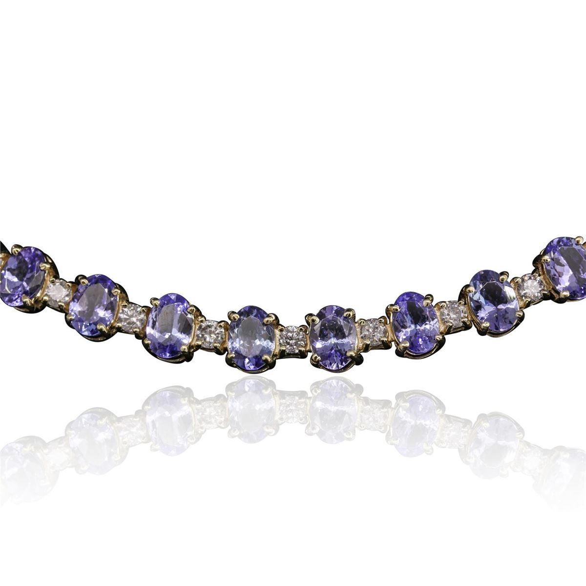 One electronically tested 14KT yellow gold Ladies combination cast & assembled necklace with a hidden box clasp with a bright polish finish. Condition is new. Measurements: 17.75" in length. Identified with markings of "14K". Containing: Fifty-two prong set oval modified brilliant cut natural tanzanites, measuring 6.86 x 4.90 x 2.70mm, approximate. Total Weight of 38.71ct., clarity is eye clean, type I, medium light, very slightly grayish, violet color, (GIA V 4/3), cut is very good. Colored gemstones are presumed to have been subjected to commonly used color/clarity enhancement processes. Fifty-Two prong set round brilliant cut diamonds, measuring 3.00 - 3.00 x 1.80mm (depth est.) approximate. Total Weight of 52 Stones = 5.62ct. Clarity: I-2 to I-3. Color: H - I, Cut is Good. Total Weight of Colored Stones 38.71ct. Total Weight of Diamonds 5.62ct. Total Weight of Necklace 44.90 grams. GGL Appraised at $54,970.00.