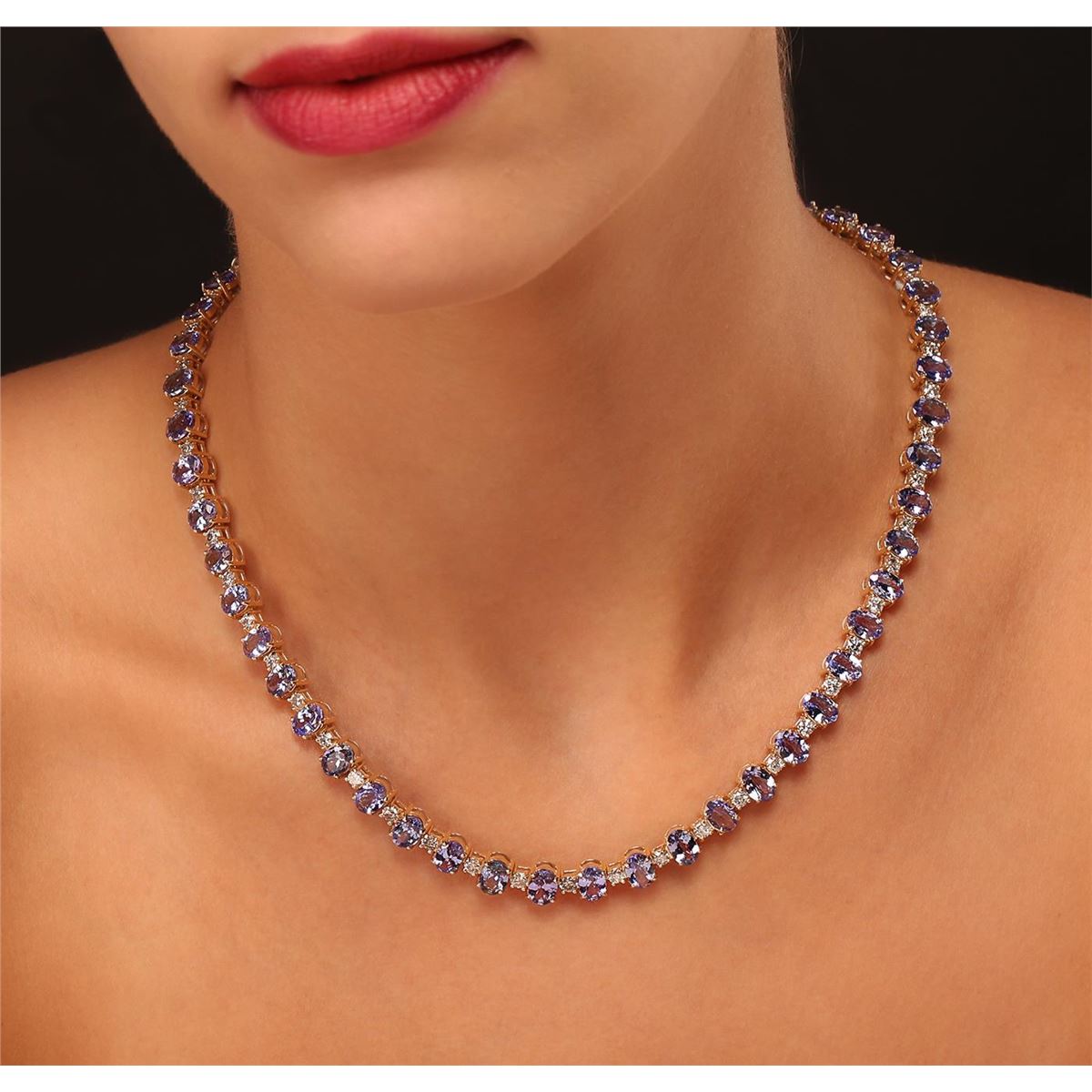One electronically tested 14KT yellow gold Ladies combination cast & assembled necklace with a hidden box clasp with a bright polish finish. Condition is new. Measurements: 17.75" in length. Identified with markings of "14K". Containing: Fifty-two prong set oval modified brilliant cut natural tanzanites, measuring 6.86 x 4.90 x 2.70mm, approximate. Total Weight of 38.71ct., clarity is eye clean, type I, medium light, very slightly grayish, violet color, (GIA V 4/3), cut is very good. Colored gemstones are presumed to have been subjected to commonly used color/clarity enhancement processes. Fifty-Two prong set round brilliant cut diamonds, measuring 3.00 - 3.00 x 1.80mm (depth est.) approximate. Total Weight of 52 Stones = 5.62ct. Clarity: I-2 to I-3. Color: I - J, Cut is Good. Total Weight of Colored Stones 38.71ct. Total Weight of Diamonds 5.62ct. Total Weight of Necklace 44.80 grams. GGL Appraised at $54,620.00.