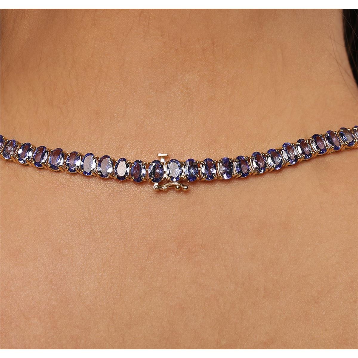 One electronically tested 14KT Yellow Gold Ladies combination cast & assembled fashion necklace with a hidden box clasp with a bright polish finish. Condition is new. Measurements: 18" inch in length. Identified with markings of "14K". Containing: Eighty prong set oval modified brilliant cut natural tanzanites, measuring 6.00 x 4.00 x 2.95mm, approximate total weight of 39.20ct., clarity is eye clean, type I, medium light, very slightly grayish, violet color, (GIA V 4/3), cut is good. Colored gemstones are presumed to have been subjected to commonly used and possible undetectable color/clarity enhancement processes. Thirty prong set round brilliant cut diamonds, measuring 2.40 - 2.40 x 1.44mm (depth est.) approximate total weight of 30 Stones = 1.30ct. Clarity of I-2 to I-3, Color of J - K, Cut is Good. Total Weight of Colored Stones 39.20ct. Total Weight of Diamonds 1.30ct. Total Weight of Necklace 36.60gm. GGL Appraised at $23,540.00.