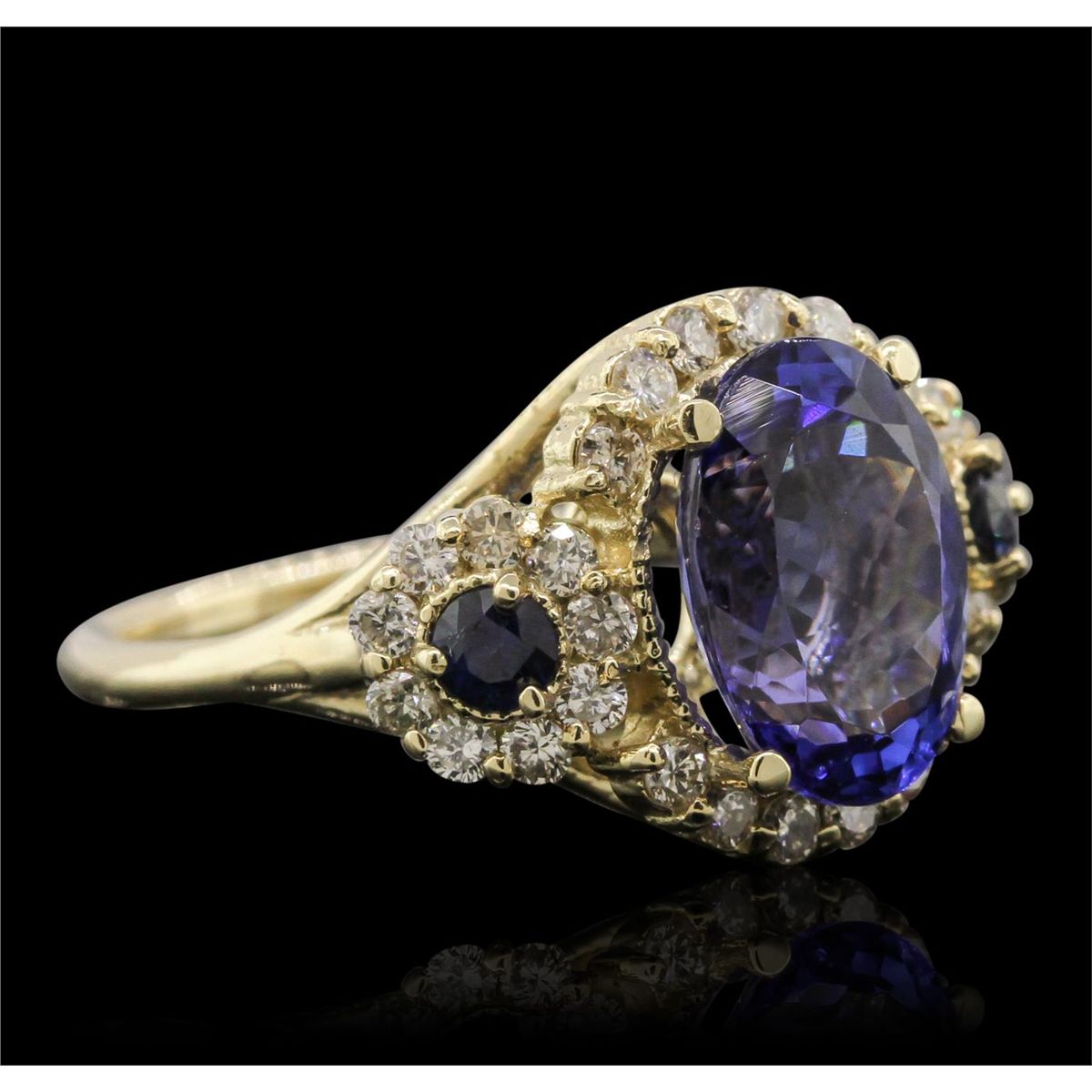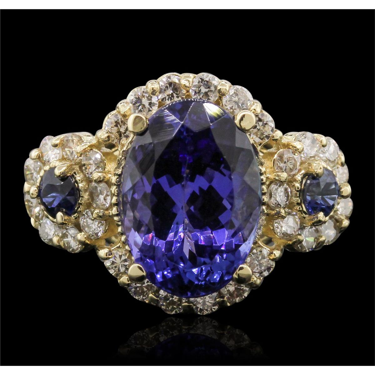 One electronically tested 14KT yellow gold Ladies combination cast & assembled ring with a bright polish finish. Condition is new. Containing: One prong set oval modified brilliant cut natural tanzanite, measuring 11.66 x 8.15 x 6.10mm, approximate weight of 4.01ct., clarity is eye clean, type I, medium, moderately strong, bluish violet color, (GIA bV 5/4), cut is very good. Two prong set round modified brilliant cut natural blue sapphires, measuring 3.10 - 3.10 x 2.02 mm, approximate. Total Weight of 0.32ct., clarity is heavily included, type II, medium dark, moderately strong, blue color, (GIA B 6/4), cut is good. Colored gemstones are presumed to have been subjected to commonly used color/clarity enhancement processes. Thirty prong set round brilliant cut diamonds, measuring 1.70 - 1.70 x 1.02mm (depth est.) approximate. Total Weight of 30 Stones = 0.54ct. Clarity: I-1 to I-3. Color: I - J, Cut is Good. Total Weight of Colored Stones 4.33ct. Total Weight of Diamonds 0.54ct. Total Weight of Ring 6.20 grams. GGL Appraised at $7,280.00.