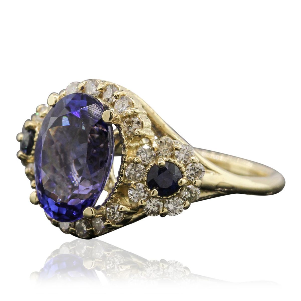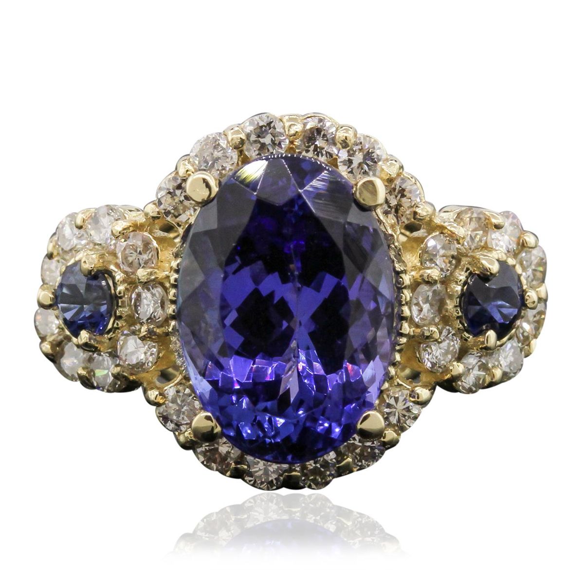 One electronically tested 14KT yellow gold Ladies combination cast & assembled ring with a bright polish finish. Condition is new. Containing: One prong set oval modified brilliant cut natural tanzanite, measuring 11.66 x 8.15 x 6.10mm, approximate weight of 4.01ct., clarity is eye clean, type I, medium, moderately strong, bluish violet color, (GIA bV 5/4), cut is very good. Two prong set round modified brilliant cut natural blue sapphires, measuring 3.10 - 3.10 x 2.02 mm, approximate. Total Weight of 0.32ct., clarity is heavily included, type II, medium dark, moderately strong, blue color, (GIA B 6/4), cut is good. Colored gemstones are presumed to have been subjected to commonly used color/clarity enhancement processes. Thirty prong set round brilliant cut diamonds, measuring 1.70 - 1.70 x 1.02mm (depth est.) approximate. Total Weight of 30 Stones = 0.54ct. Clarity: I-1 to I-3. Color: I - J, Cut is Good. Total Weight of Colored Stones 4.33ct. Total Weight of Diamonds 0.54ct. Total Weight of Ring 6.20 grams. GGL Appraised at $7,280.00.