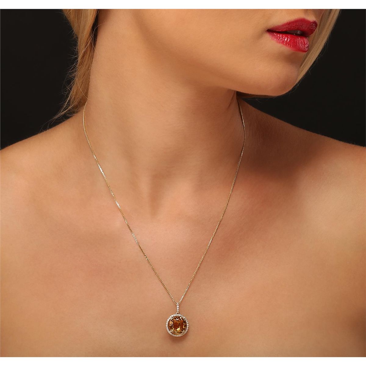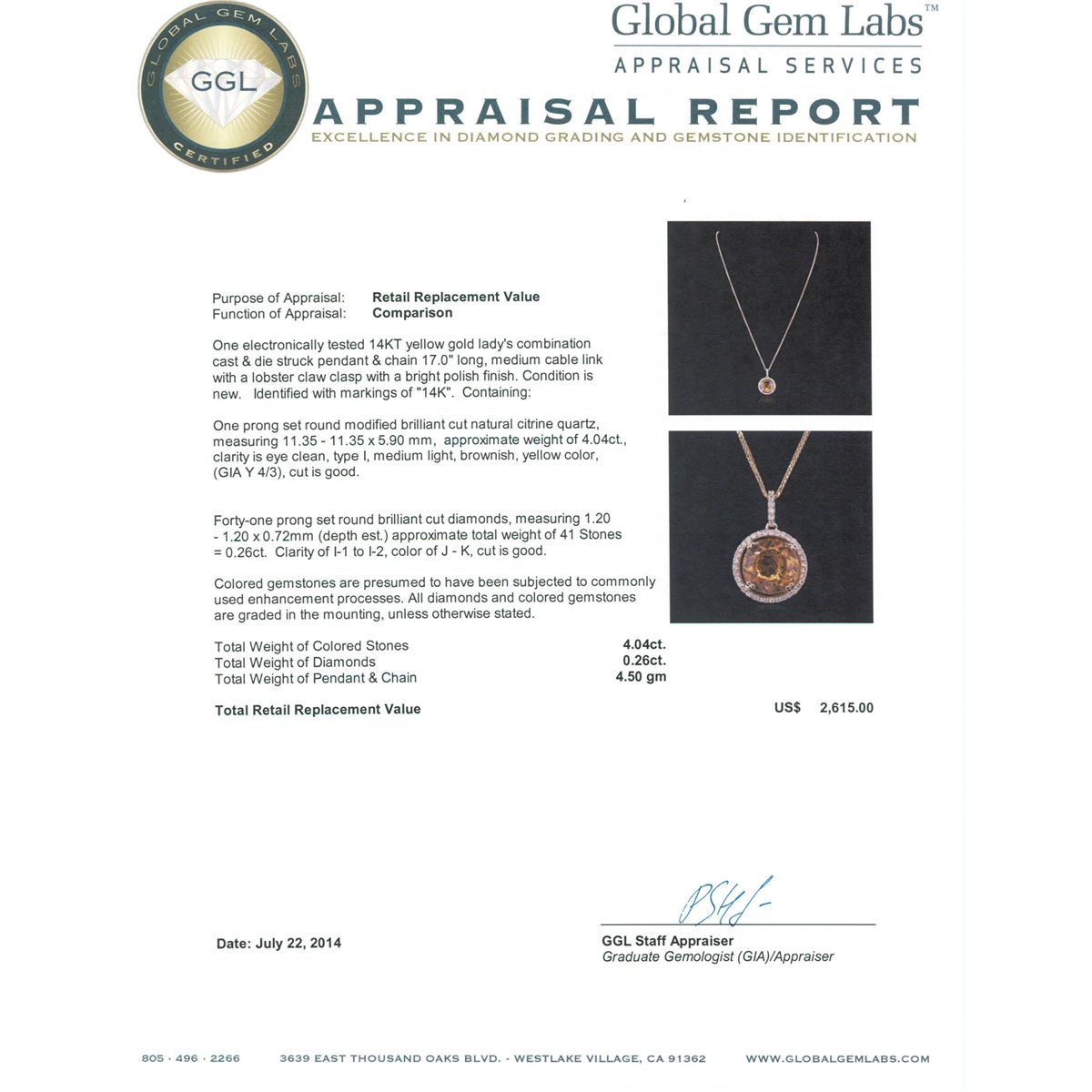 One electronically tested 14KT yellow gold ladies combination cast & die struck pendant & chain 17.0" long, medium cable link with a lobster claw clasp with a bright polish finish. Condition is new. Identified with markings of "14K". Containing: One prong set round modified brilliant cut natural citrine quartz, measuring 11.35 - 11.35 x 5.90 mm, approximate weight of 4.04ct., clarity is eye clean, type I, medium light, brownish, yellow color, (GIA Y 4/3), cut is good. Forty-One prong set round brilliant cut diamonds, measuring 1.20 - 1.20 x 0.72mm (depth est.) approximate total weight of 41 Stones = 0.26ct. Clarity: I-1 to I-2. Color: J - K, Cut is Good. Colored gemstones are presumed to have been subjected to commonly used enhancement processes. All diamonds and colored gemstones are graded in the mounting, unless otherwise stated. Total Weight of Colored Stones 4.04ct. Total Weight of Diamonds 0.26ct. Total Weight of Pendant & Chain 4.50 grams. GGL Appraised at $2,615.00.
