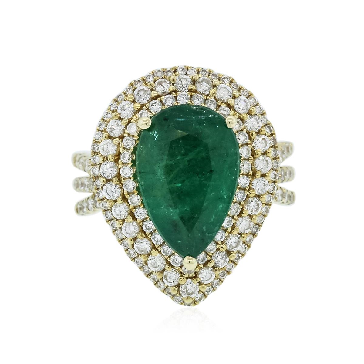 One electronically tested 14KT yellow gold ladies combination cast & assembled emerald and diamond ring with a split shoulder shank with a bright polish finish. Identified with markings of "14K". Condition is new. Containing: One prong set pear modified brilliant cut natural emerald, measuring 15.10 x 9.39 x 5.32mm, approximate weight of 4.10ct., clarity is heavily included, type III, medium, moderately strong, green color, (GIA G 5/4), cut is good. One Hundred Forty-Nine prong set round brilliant cut diamonds, measuring 1.50 - 1.00 x 0.75mm (depth est.) stated total weight of 149 Stones = 1.06ct. Clarity: I-1 to I-2. Color: I - J, Cut is Good. Colored gemstones are presumed to have been subjected to commonly used enhancement processes. All diamonds and colored gemstones are graded in the mounting, unless otherwise stated total weight of Colored Stones 4.10ct. Total Weight of Diamonds 1.06ct. Total Weight of Ring 11.00 grams. GGL Appraised at $13,685.00.