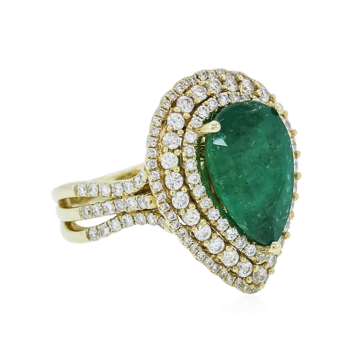 One electronically tested 14KT yellow gold ladies combination cast & assembled emerald and diamond ring with a split shoulder shank with a bright polish finish. Identified with markings of "14K". Condition is new. Containing: One prong set pear modified brilliant cut natural emerald, measuring 15.10 x 9.39 x 5.32mm, approximate weight of 4.10ct., clarity is heavily included, type III, medium, moderately strong, green color, (GIA G 5/4), cut is good. One Hundred Forty-Nine prong set round brilliant cut diamonds, measuring 1.50 - 1.00 x 0.75mm (depth est.) stated total weight of 149 Stones = 1.06ct. Clarity: I-1 to I-2. Color: I - J, Cut is Good. Colored gemstones are presumed to have been subjected to commonly used enhancement processes. All diamonds and colored gemstones are graded in the mounting, unless otherwise stated total weight of Colored Stones 4.10ct. Total Weight of Diamonds 1.06ct. Total Weight of Ring 11.00 grams. GGL Appraised at $13,685.00.