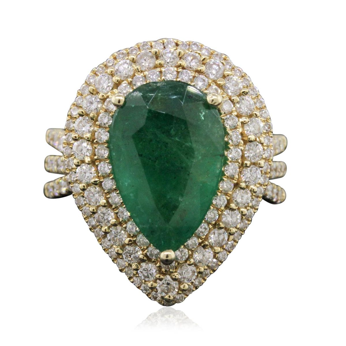 One electronically tested 14KT yellow gold ladies combination cast & assembled emerald and diamond ring with a split shoulder shank with a bright polish finish. Identified with markings of "14K". Condition is new. Containing: One prong set pear modified brilliant cut natural emerald, measuring 15.10 x 9.39 x 5.32mm, approximate weight of 4.10ct., clarity is heavily included, type III, medium, moderately strong, green color, (GIA G 5/4), cut is good. One Hundred Forty-Nine prong set round brilliant cut diamonds, measuring 1.50 - 1.00 x 0.75mm (depth est.) stated total weight of 149 Stones = 1.06ct. Clarity: I-1 to I-2. Color: I - J, Cut is Good. Colored gemstones are presumed to have been subjected to commonly used enhancement processes. All diamonds and colored gemstones are graded in the mounting, unless otherwise stated total weight of Colored Stones 4.10ct. Total Weight of Diamonds 1.06ct. Total Weight of Ring 11.00 grams. GGL Appraised at $13,685.00.