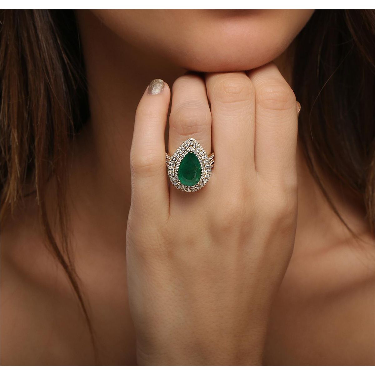 One electronically tested 14KT yellow gold ladies combination cast & assembled emerald and diamond ring with a split shoulder shank with a bright polish finish. Identified with markings of "14K". Condition is new. Containing: One prong set pear modified brilliant cut natural emerald, measuring 15.10 x 9.39 x 5.32mm, approximate weight of 4.10ct., clarity is heavily included, type III, medium, moderately strong, green color, (GIA G 5/4), cut is good. One Hundred Forty-Nine prong set round brilliant cut diamonds, measuring 1.50 - 1.00 x 0.75mm (depth est.) stated total weight of 149 Stones = 1.06ct. Clarity: I-1 to I-2. Color: I - J, Cut is Good. Colored gemstones are presumed to have been subjected to commonly used enhancement processes. All diamonds and colored gemstones are graded in the mounting, unless otherwise stated total weight of Colored Stones 4.10ct. Total Weight of Diamonds 1.06ct. Total Weight of Ring 11.00 grams. GGL Appraised at $13,685.00.