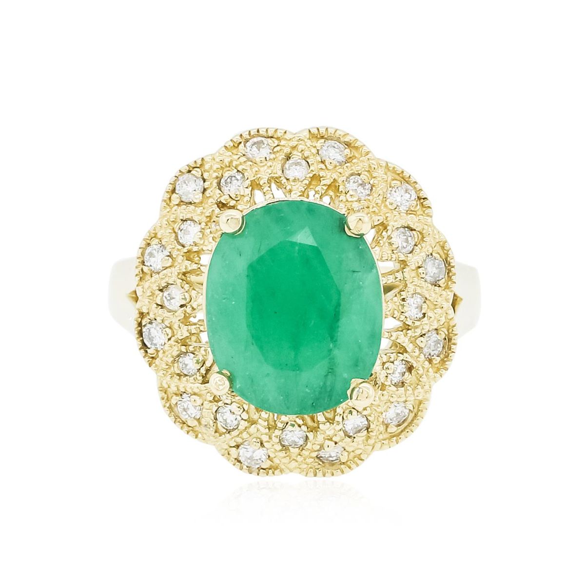 One electronically tested 14KT yellow gold ladies combination cast & assembled emerald and diamond ring with a flat shank with a bright polish finish. Identified with markings of "14K". Condition is new. Containing: One prong set oval modified brilliant cut natural emerald, measuring 11.67 x 9.66 x 6.62mm, approximate weight of 4.10ct., clarity is heavily included, type III, medium light, moderately strong, green color, (GIA G 4/4), cut is good. Twenty-Four prong set round brilliant cut diamonds, measuring 1.30 - 1.30 x 0.78mm (depth est.) approximate total weight of 24 Stones = 0.19ct. Clarity: SI-1 to SI-2. Color: I - J, Cut is Good. Colored gemstones are presumed to have been subjected to commonly used enhancement processes. All diamonds and colored gemstones are graded in the mounting, unless otherwise stated. Total Weight of Colored Stones 4.10ct. Total Weight of Diamonds 0.19ct. Total Weight of Ring 8.00 grams. GGL Appraised at $6,620.00.