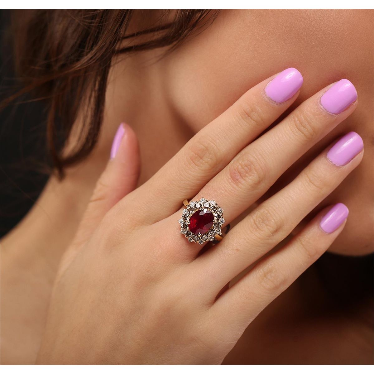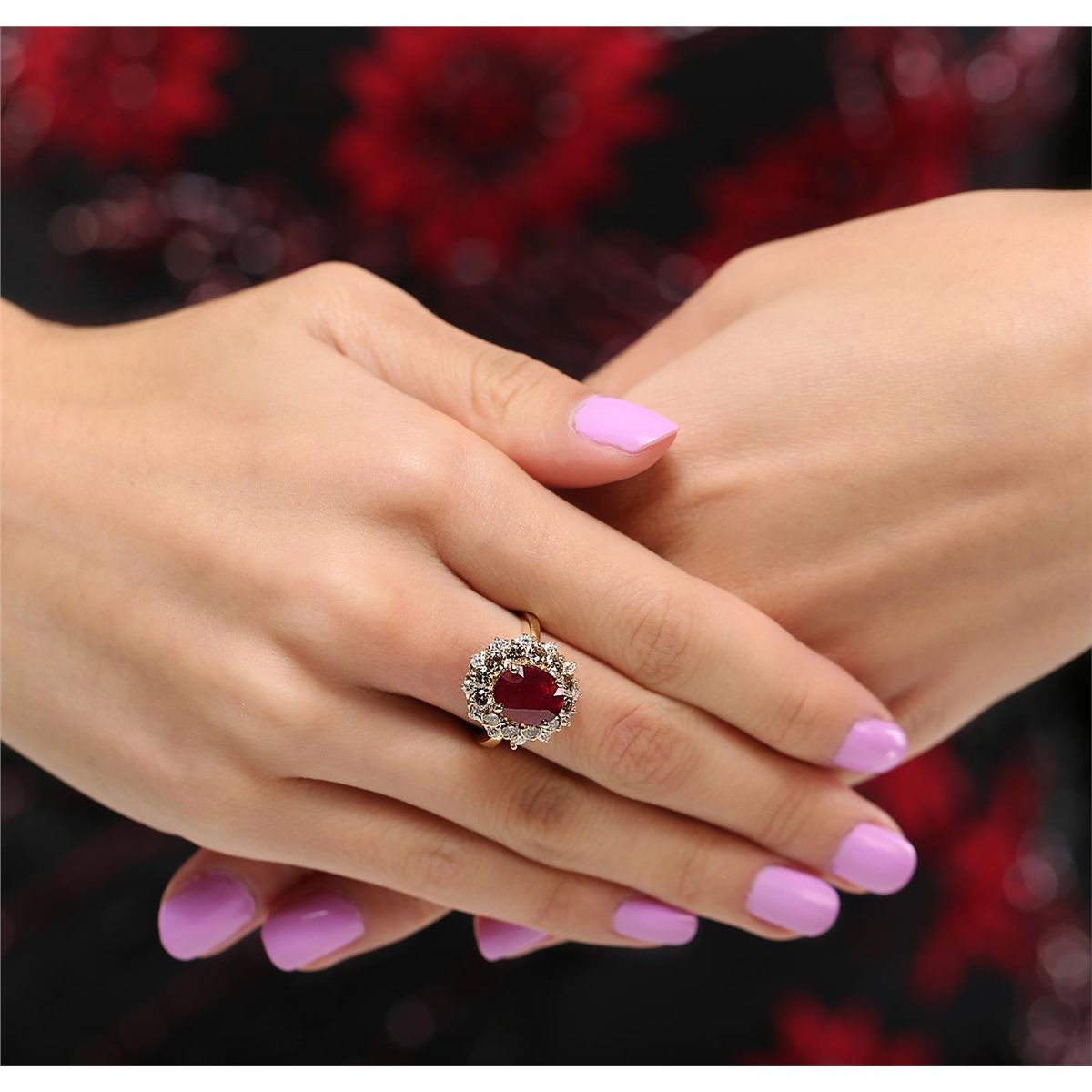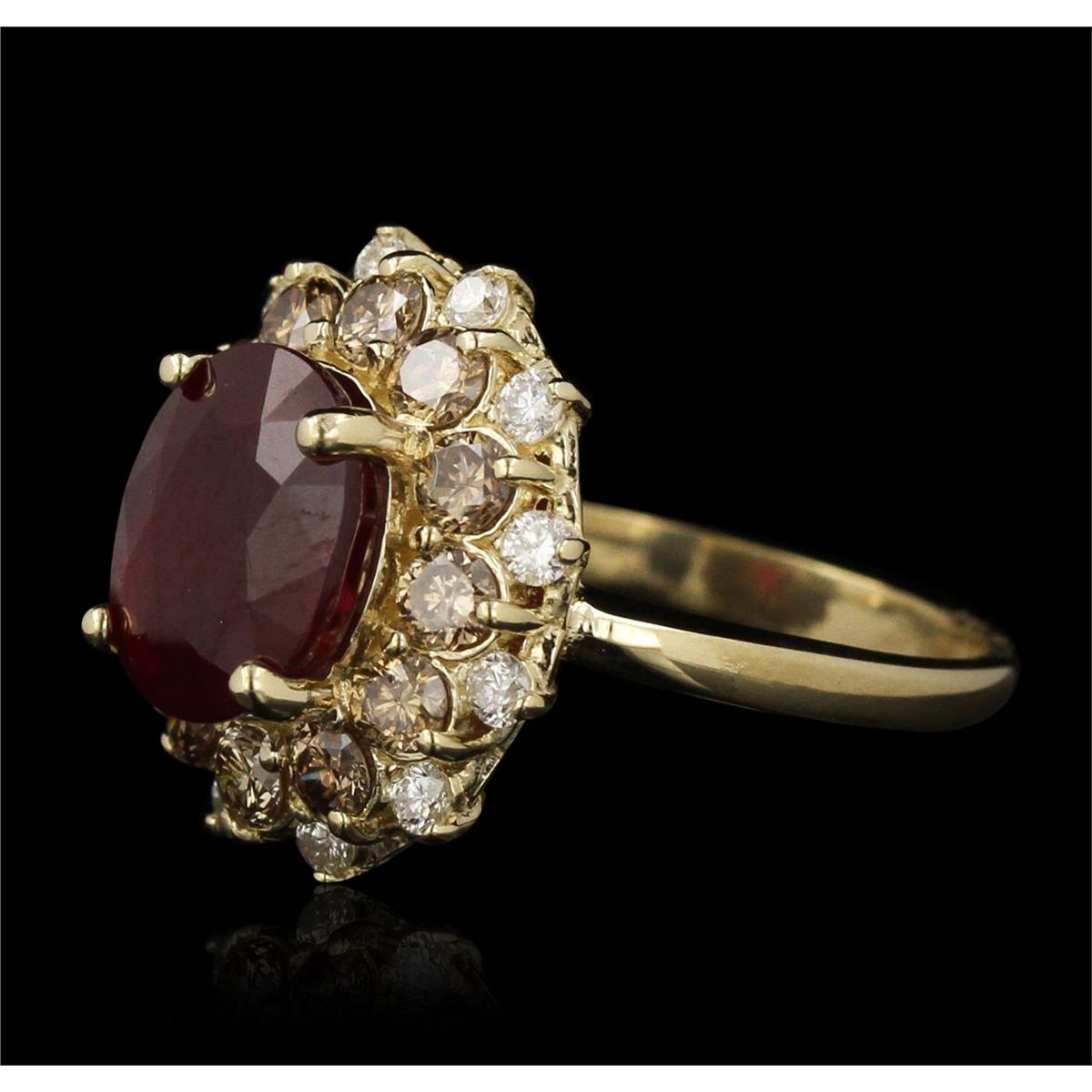 One electronically tested 14KT yellow gold Ladies combination cast & assembled cocktail ring with a bright polish finish. Identified with markings of "14K". Condition is excellent. Containing: One prong set oval modified brilliant cut natural ruby, measuring 10.00 x 7.50 x 5.70mm, approximate weight of 4.10ct., clarity is heavily included, type II, medium dark, moderately strong, strongly purplish red color, (GIA stpR 6/4), cut is good. Colored gemstones are presumed to have been subjected to commonly used and possible undetectable color/clarity enhancement processes. Twelve prong set round brilliant cut diamonds, measuring 1.90 - 1.90 x 1.14mm (depth est.) approximate total weight of 12 Stones = 0.40ct. Clarity of SI-2 to I-2, Color of I - J, Cut is Good. Fourteen prong set round brilliant cut diamonds, measuring 2.90 - 2.90 x 1.74mm (depth est.) approximate total weight of 14 Stones = 1.02ct. Clarity of SI-1 to SI-2, Cut is Good. Total Weight of Colored Stones 4.10ct. Total Weight of Diamonds 1.42ct. Total Weight of Ring 6.10gm. GGL Appraised at $5,785.00.