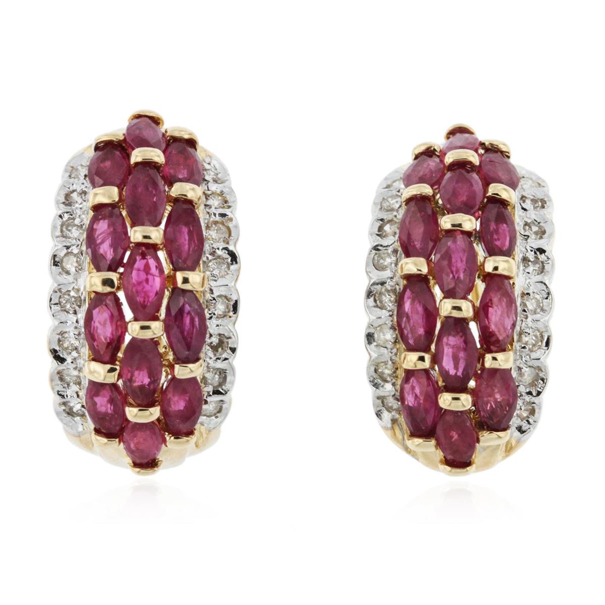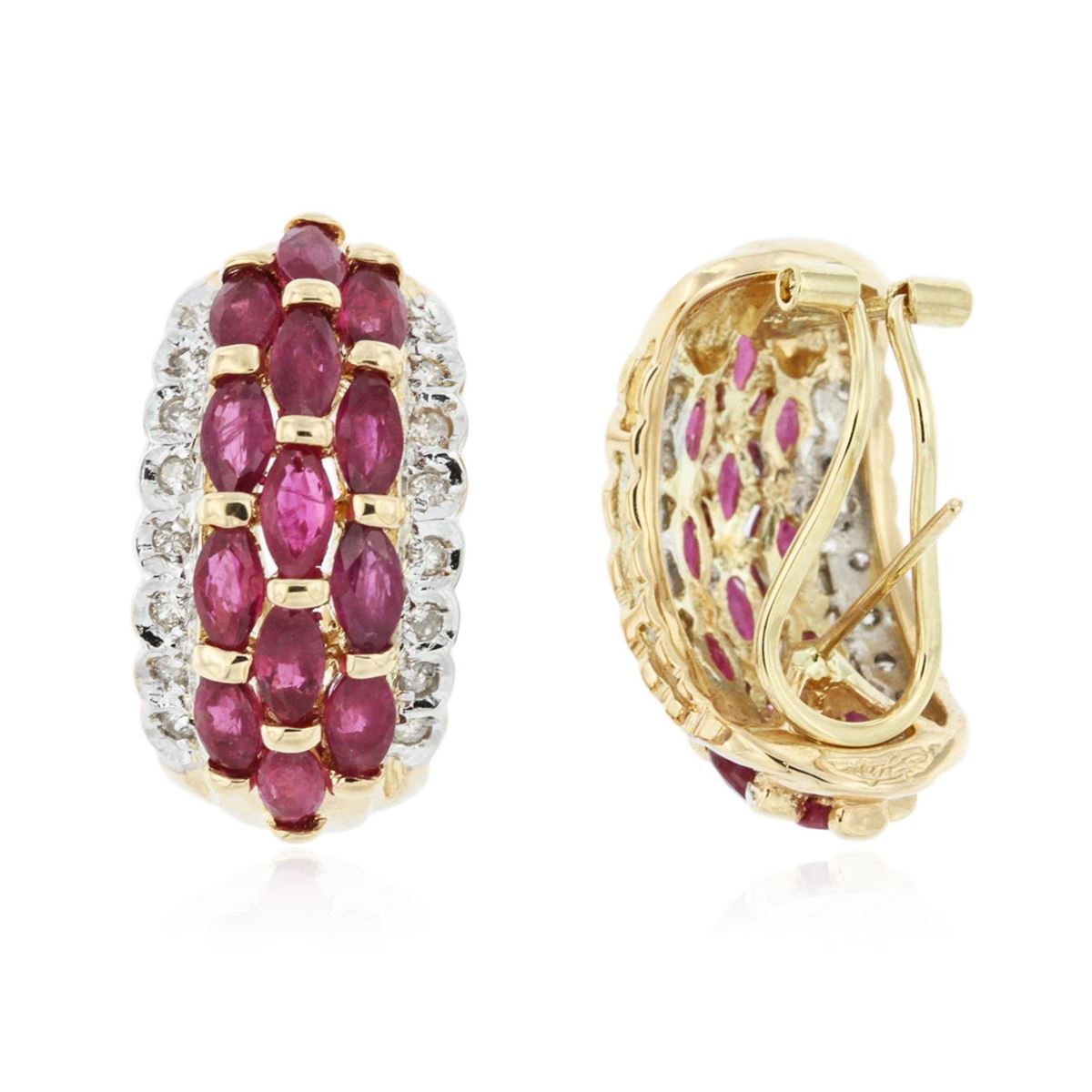 One pair electronically tested 14KT yellow gold ladies cast & assembled ruby and diamond earrings with omega backs. Condition is new, good workmanship. Each earring features a stylized ruby curvature set within mirroring diamond ribbons. Bright polish finish with rhodium accents. Identified with markings of "14K 585". Containing: Twenty-six prong set marquise mixed cut natural rubies, measuring 5.00 x 2.50 x 1.63mm, 5%. bulge factor, approximate. Total Weight of 4.16ct., clarity is moderately included, type II, medium dark, very slightly brownish, slightly purplish red color, (GIA slpR 6/3), cut is good. Transmitting light somewhat diffusely, transparent to translucent. Naturally occurring internal & external characteristics are present. Measurements & the color grade are an average for the group. Graded in the setting. Ruby has a low tolerance to rhodium plating, repolishing the surface, & ultrasonic cleaning. Thirty-Two bead set round brilliant cut diamonds, measuring 1.50 - 1.40 x 0.87mm (depth est.) approximate. Total Weight of 32 Stones = 0.45ct. Graded in the setting. Clarity: I-1 to I-2. Color: H - J. Total Weight of Colored Stones 4.16ct. Total Weight of Diamonds 0.45ct. Total Weight of Earrings 9.72 grams. AIG Appraised at $5,950.00.
