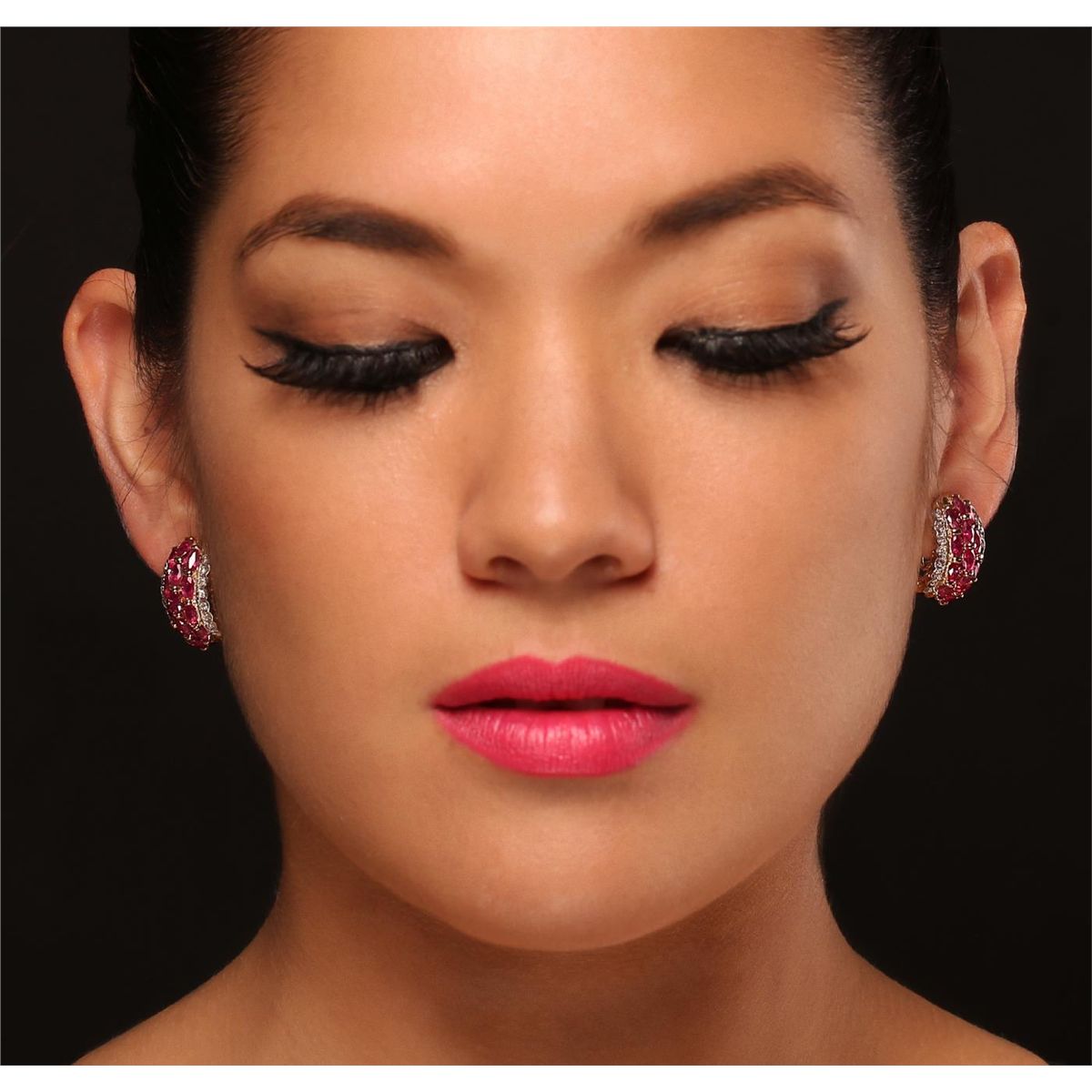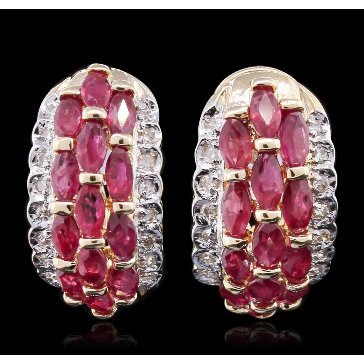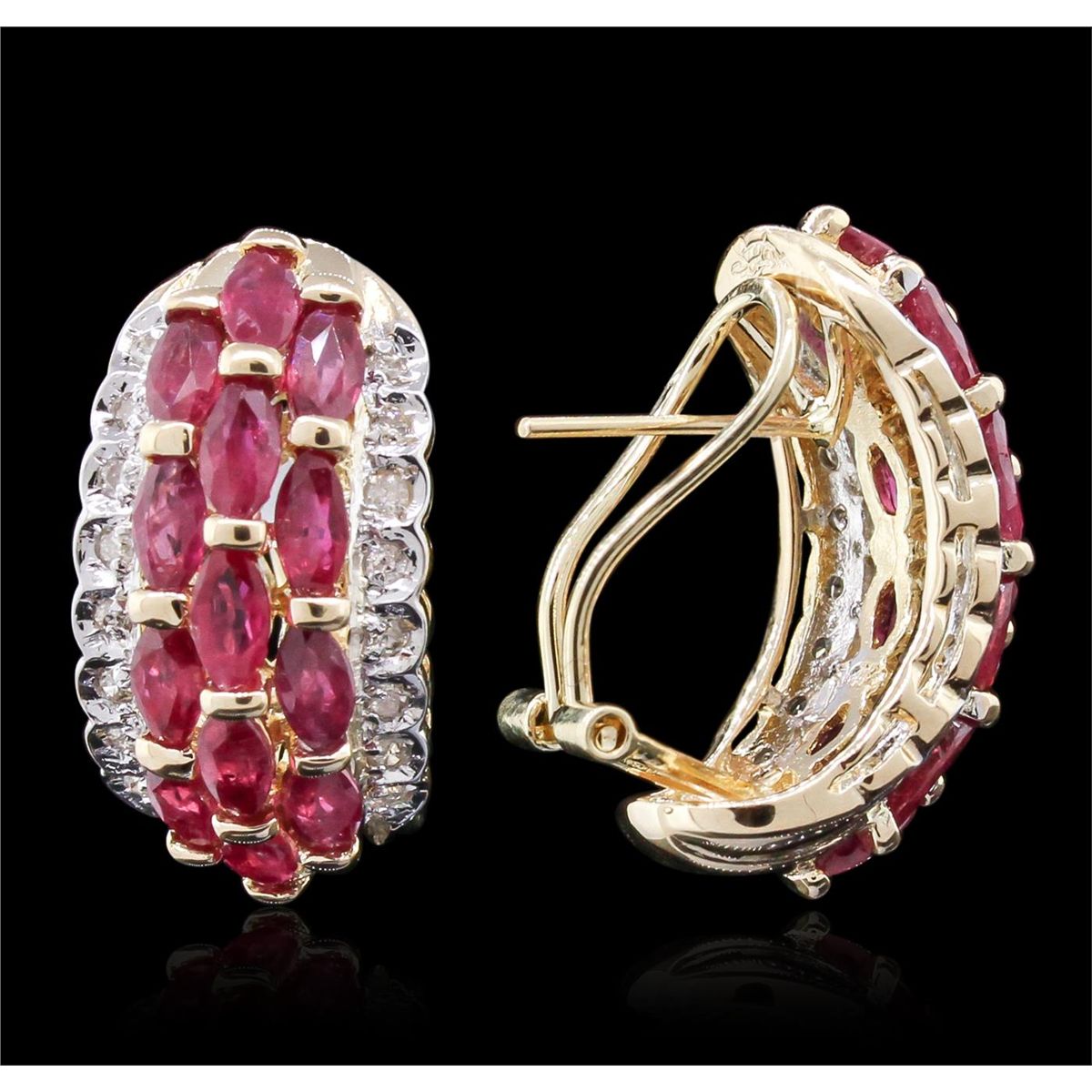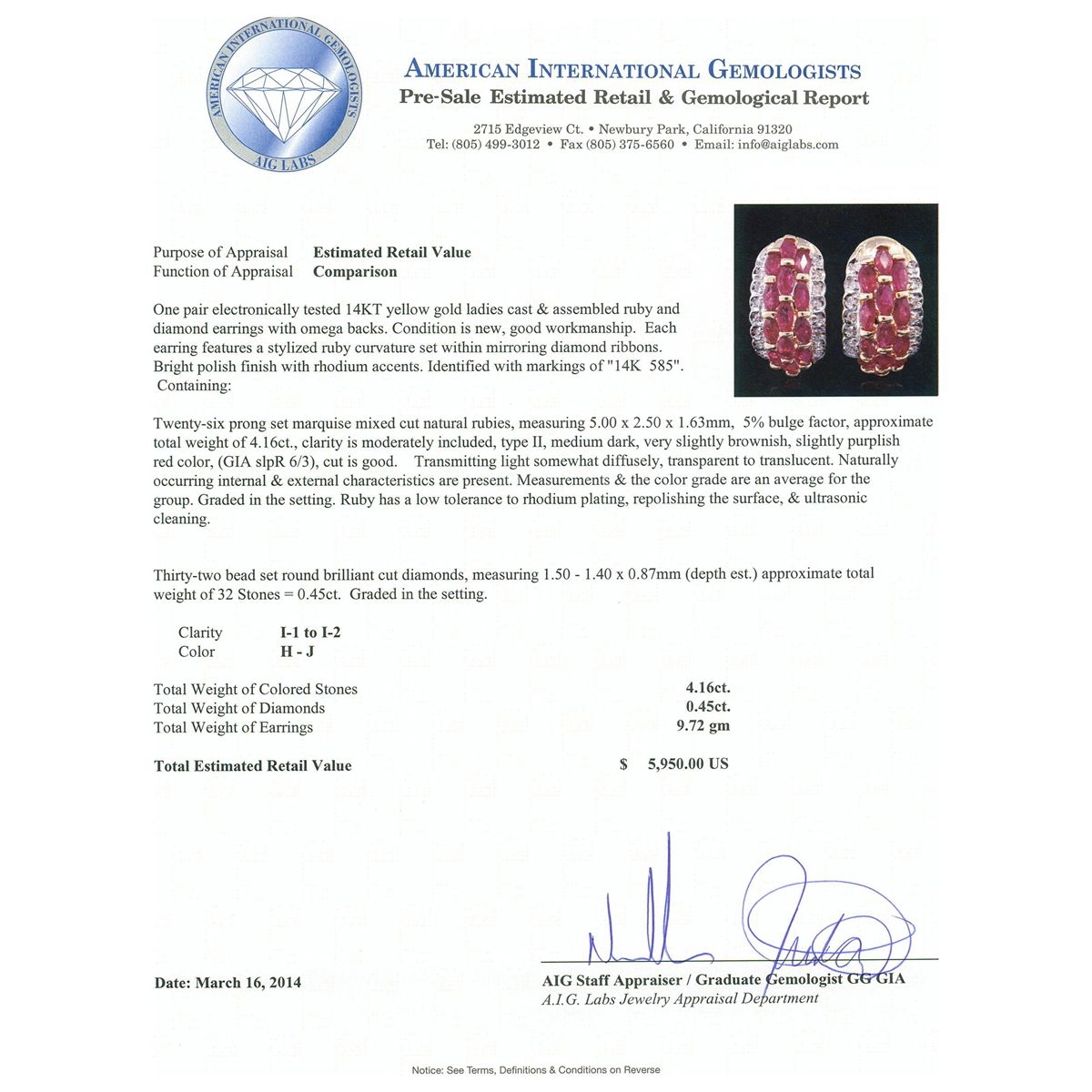 One pair electronically tested 14KT yellow gold ladies cast & assembled ruby and diamond earrings with omega backs. Condition is new, good workmanship. Each earring features a stylized ruby curvature set within mirroring diamond ribbons. Bright polish finish with rhodium accents. Identified with markings of "14K 585". Containing: Twenty-six prong set marquise mixed cut natural rubies, measuring 5.00 x 2.50 x 1.63mm, 5%. bulge factor, approximate. Total Weight of 4.16ct., clarity is moderately included, type II, medium dark, very slightly brownish, slightly purplish red color, (GIA slpR 6/3), cut is good. Transmitting light somewhat diffusely, transparent to translucent. Naturally occurring internal & external characteristics are present. Measurements & the color grade are an average for the group. Graded in the setting. Ruby has a low tolerance to rhodium plating, repolishing the surface, & ultrasonic cleaning. Thirty-Two bead set round brilliant cut diamonds, measuring 1.50 - 1.40 x 0.87mm (depth est.) approximate. Total Weight of 32 Stones = 0.45ct. Graded in the setting. Clarity: I-1 to I-2. Color: H - J. Total Weight of Colored Stones 4.16ct. Total Weight of Diamonds 0.45ct. Total Weight of Earrings 9.72 grams. AIG Appraised at $5,950.00.
