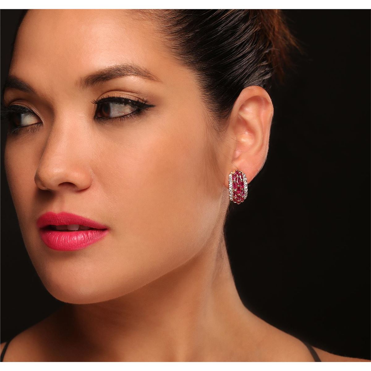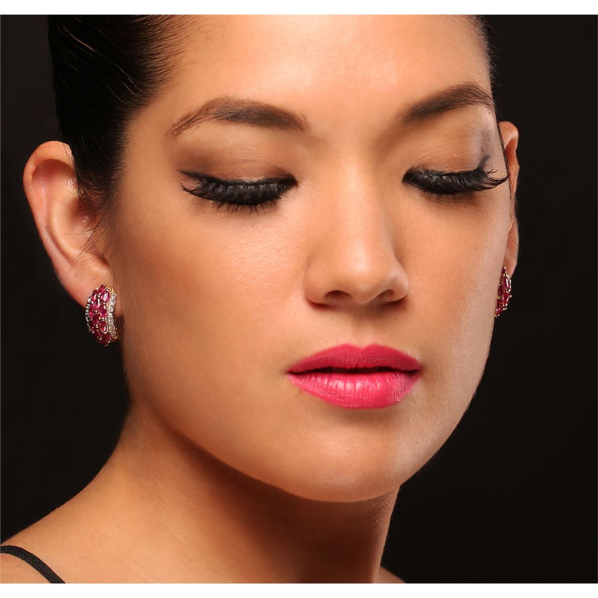One pair electronically tested 14KT yellow gold ladies cast & assembled ruby and diamond earrings with omega backs. Condition is new, good workmanship. Each earring features a stylized ruby curvature set within mirroring diamond ribbons. Bright polish finish with rhodium accents. Identified with markings of "14K 585". Containing: Twenty-six prong set marquise mixed cut natural rubies, measuring 5.00 x 2.50 x 1.63mm, 5%. bulge factor, approximate. Total Weight of 4.16ct., clarity is moderately included, type II, medium dark, very slightly brownish, slightly purplish red color, (GIA slpR 6/3), cut is good. Transmitting light somewhat diffusely, transparent to translucent. Naturally occurring internal & external characteristics are present. Measurements & the color grade are an average for the group. Graded in the setting. Ruby has a low tolerance to rhodium plating, repolishing the surface, & ultrasonic cleaning. Thirty-Two bead set round brilliant cut diamonds, measuring 1.50 - 1.40 x 0.87mm (depth est.) approximate. Total Weight of 32 Stones = 0.45ct. Graded in the setting. Clarity: I-1 to I-2. Color: H - J. Total Weight of Colored Stones 4.16ct. Total Weight of Diamonds 0.45ct. Total Weight of Earrings 9.72 grams. AIG Appraised at $5,950.00.