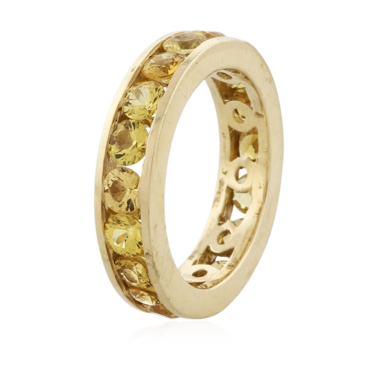 One electronically tested 14KT yellow gold ladies cast sapphire ring with a bright polish finish. Condition is new. Containing: Nineteen channel set round modified brilliant cut natural yellow sapphires, measuring 3.50 - 3.50 x 2.28 mm,approximate total weight of 4.18ct., clarity is moderately included, type II, medium light, brownish, yellow color, (GIA Y 4/3), cut is good. Colored gemstones are presumed to have been subjected to commonly used enhancement processes. All colored gemstones are graded in the mounting, unless otherwise stated. Total Weight of Colored Stones 4.18ct. Total Weight of Ring 6.40 grams. GGL Appraised at $3,255.00.