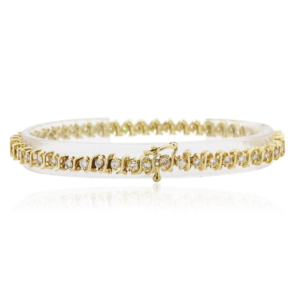 One electronically tested 14KT yellow gold ladies cast diamond tennis bracelet with a hidden box clasp with safety closer with a bright polish finish. Measurements: 8 inches length Identified with markings of "14K". Condition is very good. Containing: Forty-Seven prong set round brilliant cut diamonds, measuring 2.90 - 2.90 x 1.74mm (depth est.) approximate total weight of 47 Stones = 4.19ct. Clarity: SI-2 to I-1. Color: J - K. All diamonds are graded in the mounting, unless otherwise stated. Total Weight of Diamonds 4.19ct. Total Weight of Tennis Bracelet 13.80 grams. GGL Appraised at $6,050.00.