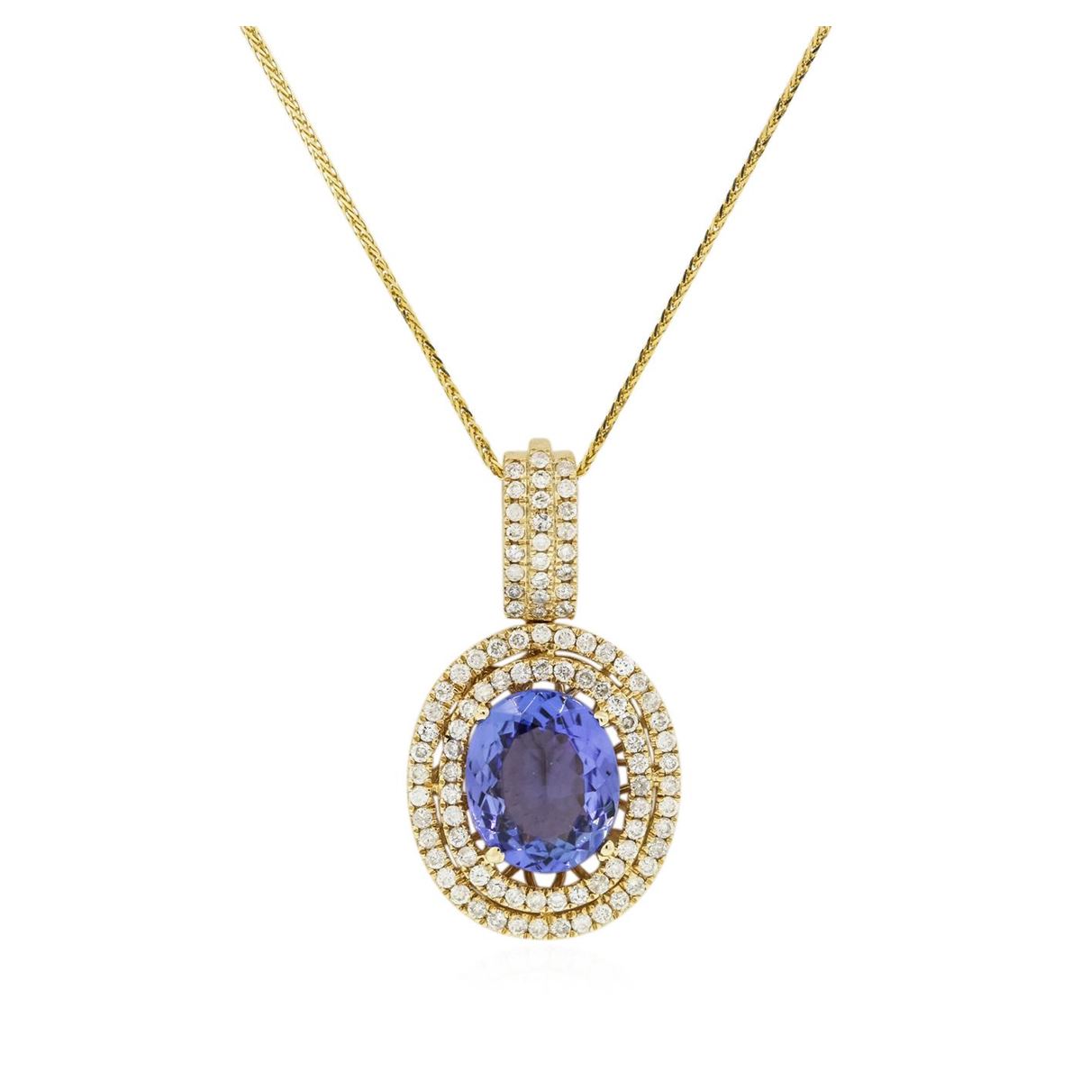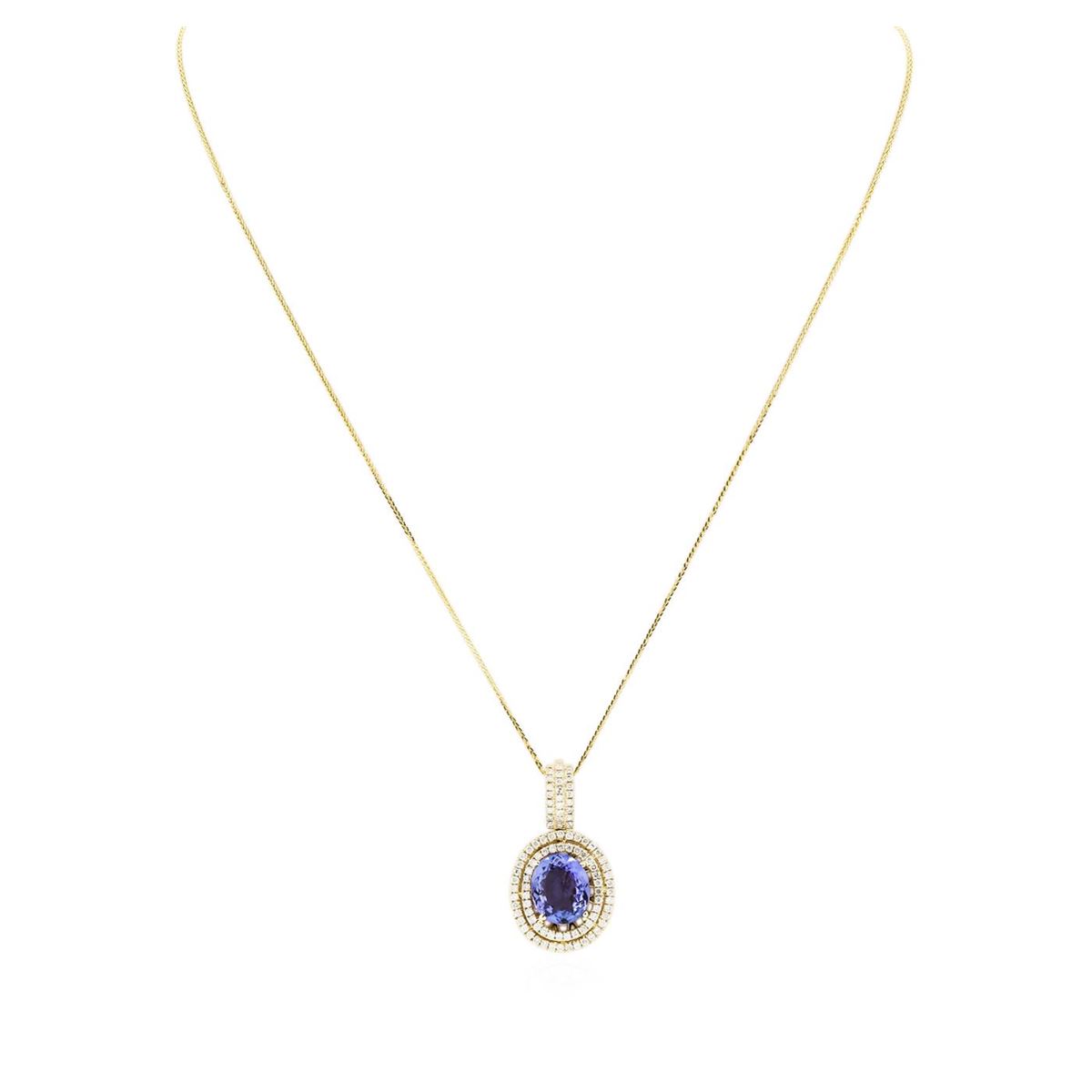 One electronically tested 14KT yellow gold Ladies combination cast & die struck pendant & chain 17.0" long, small fancy cable link with a lobster claw clasp with a bright polish finish. Condition is new. Identified with markings of "14K". Containing: One prong set oval modified brilliant cut natural tanzanite, measuring 12.00 x 10.00 x 4.80mm, approximate weight of 4.20ct., clarity is eye clean, type I, medium light, very slightly grayish, violet color, (GIA V 4/3), cut is good. Colored gemstones are presumed to have been subjected to commonly used color/clarity enhancement processes. Ninety-Five prong set round brilliant cut diamonds, measuring 1.30 - 1.30 x 0.78mm (depth est.) approximate. Total Weight of 95 Stones = 0.97ct. Clarity: I-2 to I-3. Color: I - J, Cut is Good. Total Weight of Colored Stones 4.20ct. Total Weight of Diamonds 0.97ct. Total Weight of Pendant & Chain 7.60 grams. GGL Appraised at $11,645.00.