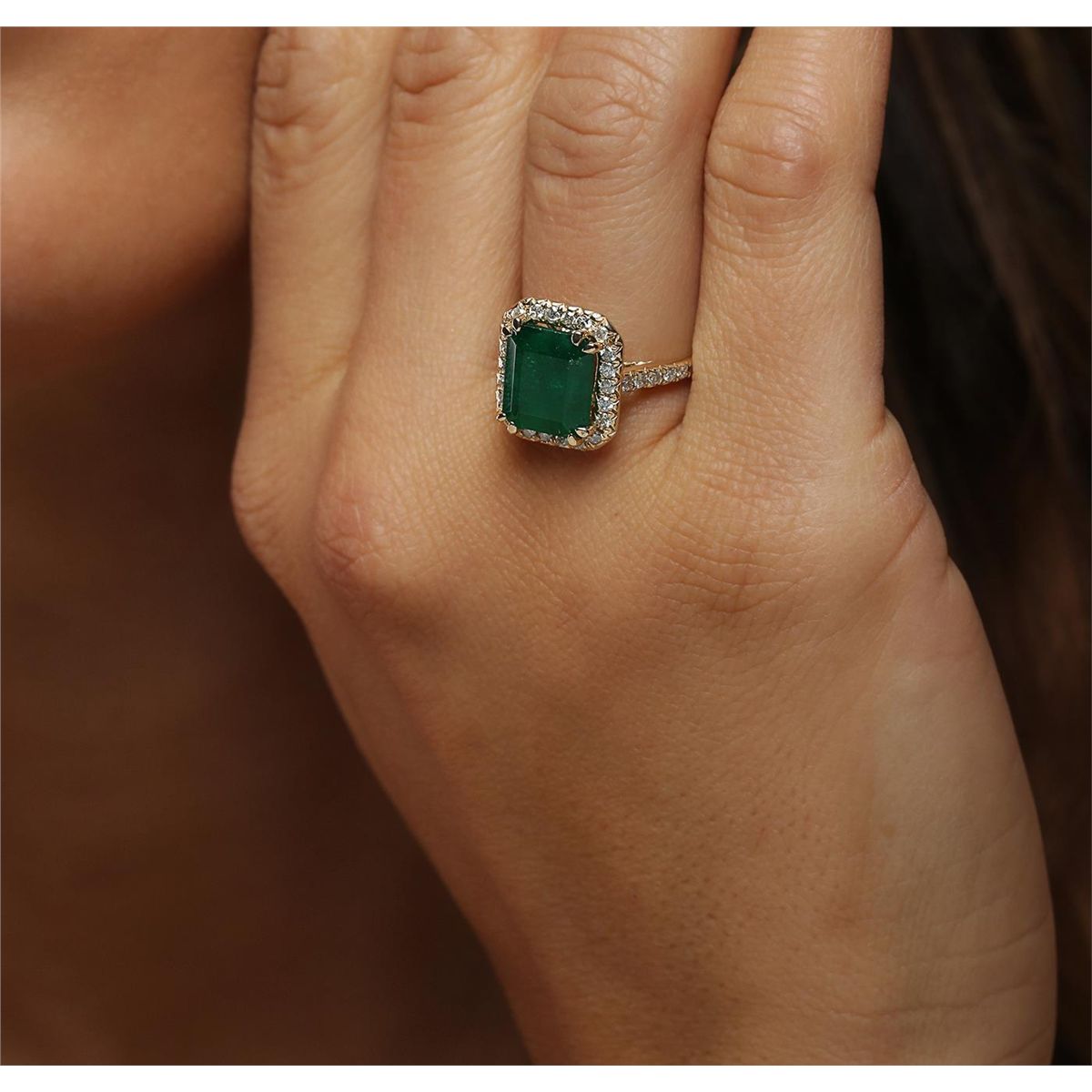 One electronically tested 14KT yellow gold Ladies combination cast & assembled ring with a bright polish finish. Condition is new. Identified with markings of "14K". Containing: One prong set emerald standard step cut natural emerald, measuring 10.06 x 9.00 x 6.40mm, approximate weight of 4.26ct., clarity is heavily included, type III, medium, moderately strong, green color, (GIA G 5/4), cut is good. Colored gemstones are presumed to have been subjected to commonly used color/clarity enhancement processes. Thirty-Four prong set round brilliant cut diamonds, measuring 1.50 - 1.50 x 0.90mm (depth est.) approximate. Total Weight of 34 Stones = 0.42ct. Clarity: I-1 to I-2. Color: I - J, Cut is Good. All grading of diamonds and colored gemstones in this piece of jewelry are graded in the mounting, unless otherwise stated. Total Weight of Colored Stones 4.26ct. Total Weight of Diamonds 0.42ct. Total Weight of Ring 5.20 grams. GGL Appraised at $10,735.00.