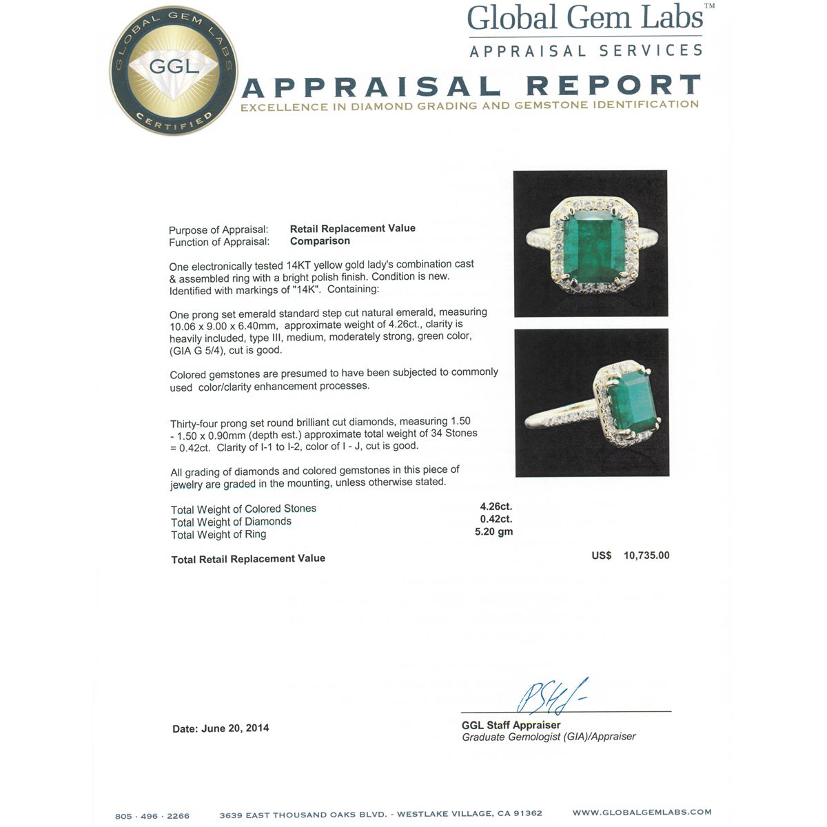 One electronically tested 14KT yellow gold Ladies combination cast & assembled ring with a bright polish finish. Condition is new. Identified with markings of "14K". Containing: One prong set emerald standard step cut natural emerald, measuring 10.06 x 9.00 x 6.40mm, approximate weight of 4.26ct., clarity is heavily included, type III, medium, moderately strong, green color, (GIA G 5/4), cut is good. Colored gemstones are presumed to have been subjected to commonly used color/clarity enhancement processes. Thirty-Four prong set round brilliant cut diamonds, measuring 1.50 - 1.50 x 0.90mm (depth est.) approximate. Total Weight of 34 Stones = 0.42ct. Clarity: I-1 to I-2. Color: I - J, Cut is Good. All grading of diamonds and colored gemstones in this piece of jewelry are graded in the mounting, unless otherwise stated. Total Weight of Colored Stones 4.26ct. Total Weight of Diamonds 0.42ct. Total Weight of Ring 5.20 grams. GGL Appraised at $10,735.00.