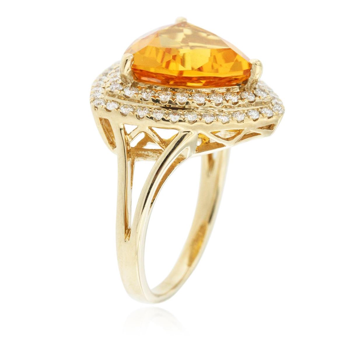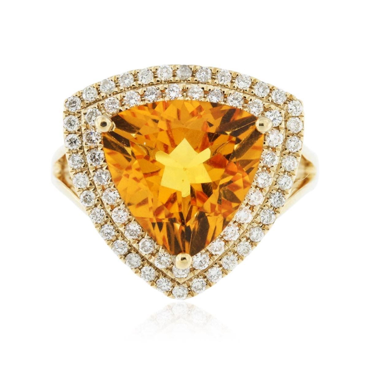 One electronically tested 14KT yellow gold Ladies combination cast & assembled ring with a bright polish finish. Condition is new. Identified with markings of "14K". Containing: Sixty-Five prong set round brilliant cut diamonds, measuring 1.30 - 1.30 x 0.78mm (depth est.) approximate. Total Weight of 65 Stones = 0.63ct. Clarity: I-1 to I-2. Color: H - I, Cut is Good. One triangle modified mixed cut natural citrine quartz, measuring 12.00 x 12.00 x 6.40mm, approximate weight of 4.28ct., type I Colored gemstones are presumed to have been subjected to commonly used color/clarity enhancement processes. Total Weight of Colored Stones 4.28ct. Total Weight of Diamonds 0.63ct. Total Weight of Ring 5.90 grams. GGL Appraised at $4,015.00.