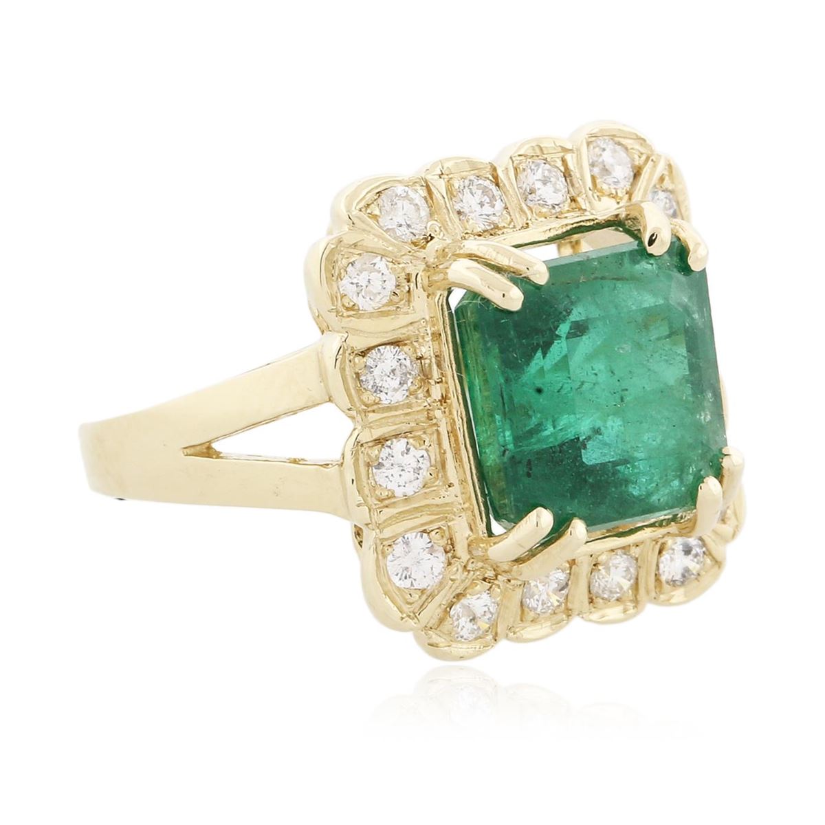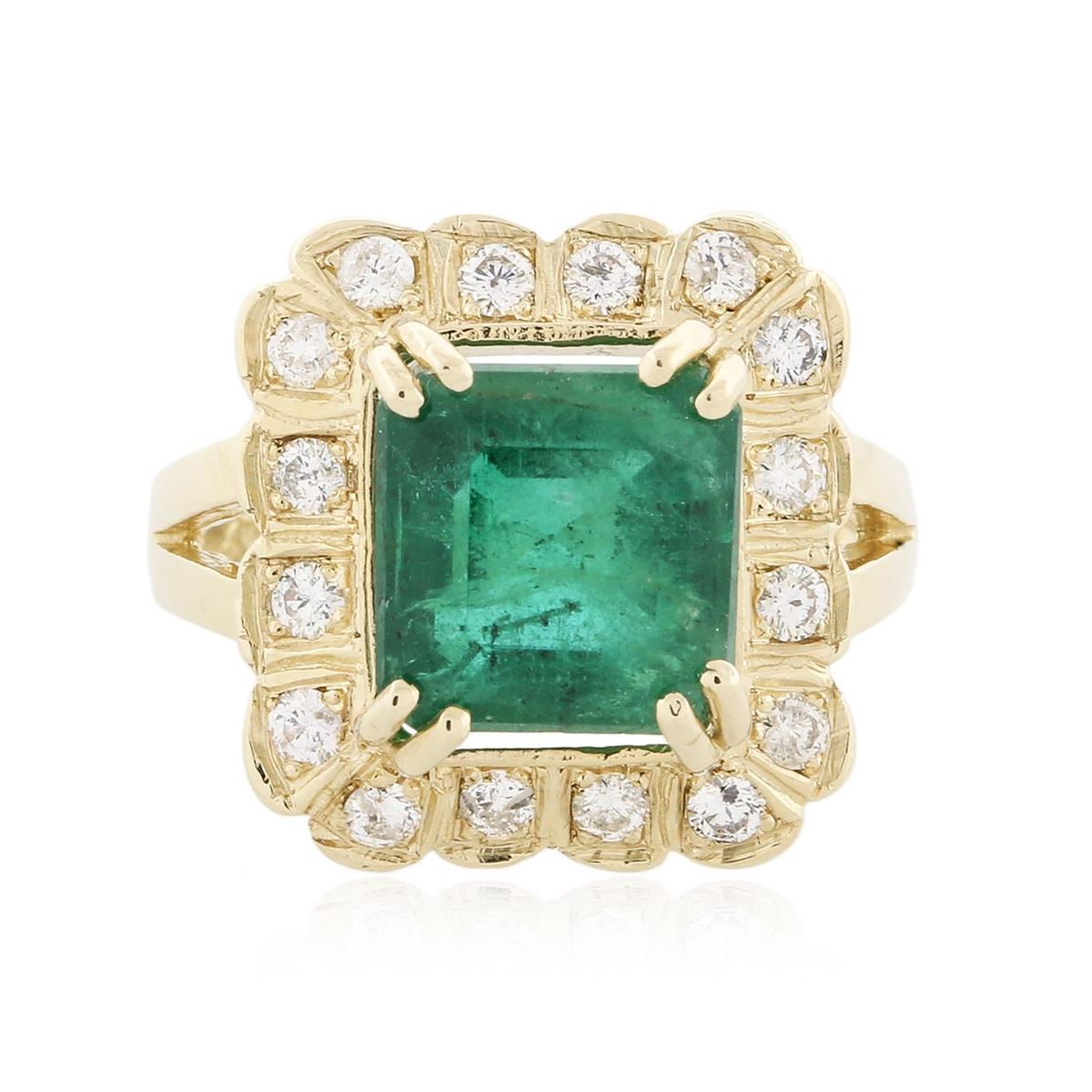 Great Condition! One electronically tested 14KT yellow gold Ladies combination cast & assembled fashion ring with a bright polish finish. Condition is new. Identified with markings of "14K". Containing: One prong set emerald standard step cut natural emerald, measuring 9.00 x 9.00 x 7.20mm, approximate weight of 4.28ct., clarity is heavily included, type III, medium dark, moderately strong, very slightly bluish green color, (GIA vslbG 6/4), cut is good. Colored gemstones are presumed to have been subjected to commonly used and possible undetectable color/clarity enhancement processes. Sixteen bead set round brilliant cut diamonds, measuring 1.90 - 1.90 x 1.14mm (depth est.) approximate total weight of 16 Stones = 0.40ct. Clarity of I-1 to I-2, Color of J - K, Cut is Good. Total Weight of Colored Stones 4.28ct. Total Weight of Diamonds 0.40ct. Total Weight of Ring 6.40 grams. GGL Appraised at $10,985.00.
