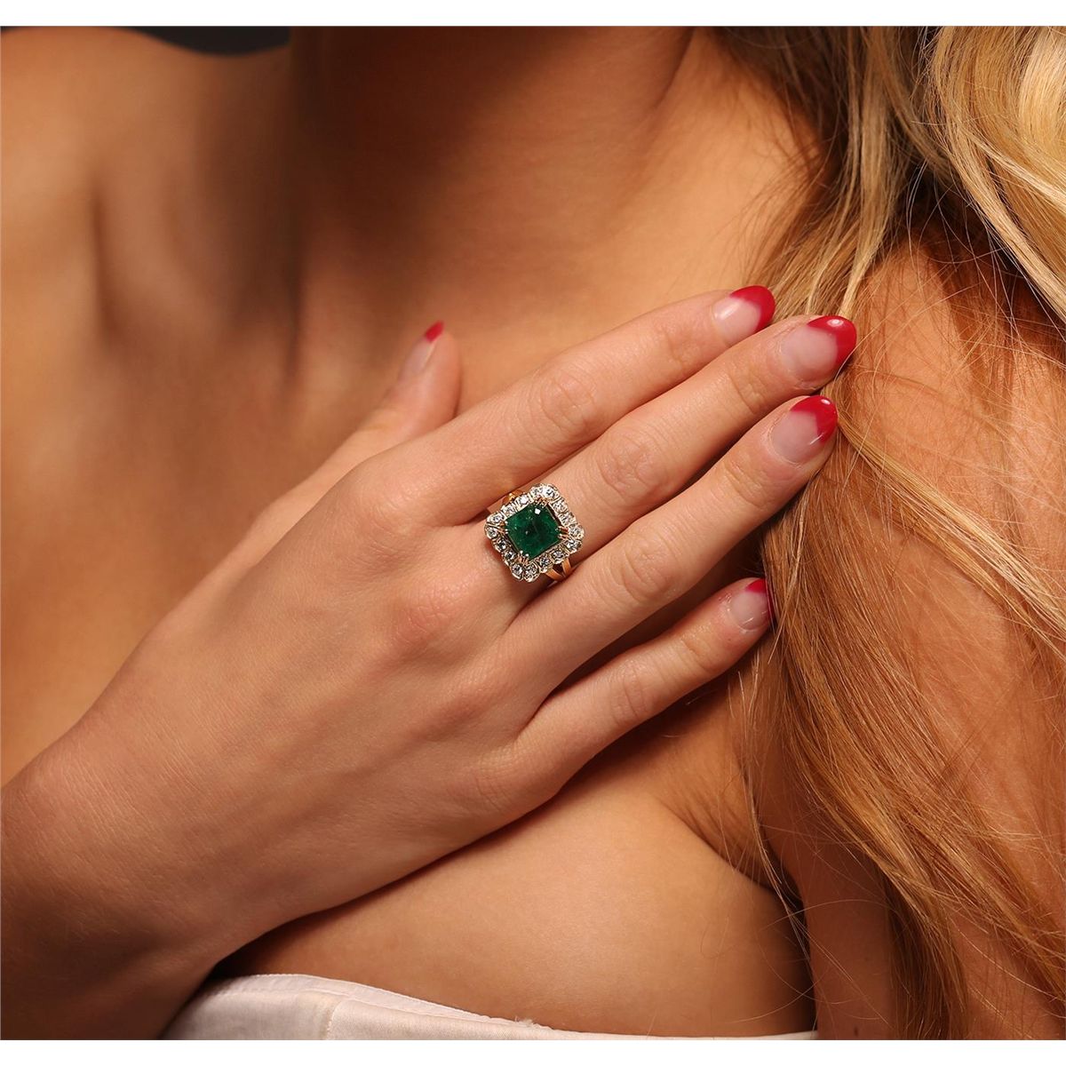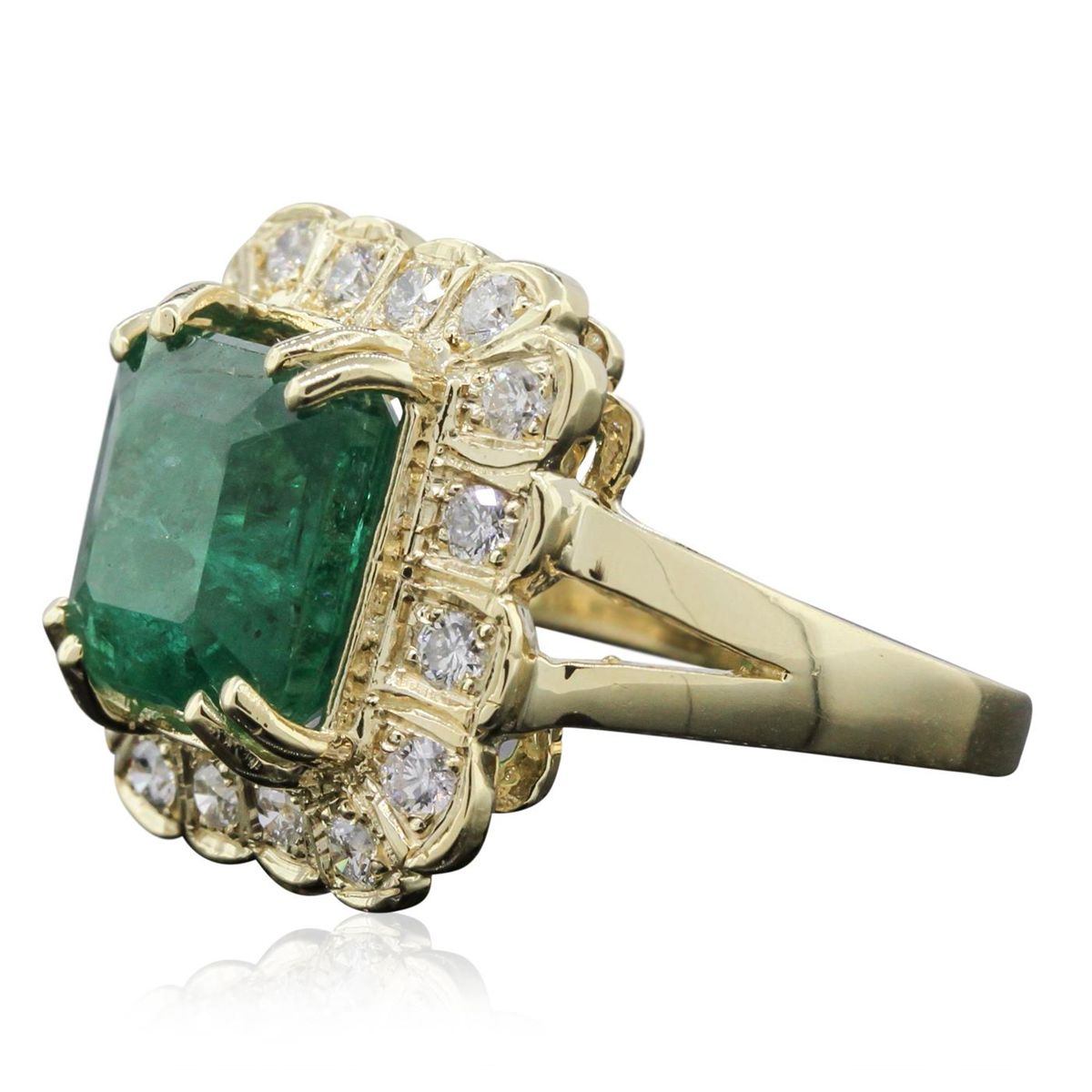Great Condition! One electronically tested 14KT yellow gold Ladies combination cast & assembled fashion ring with a bright polish finish. Condition is new. Identified with markings of "14K". Containing: One prong set emerald standard step cut natural emerald, measuring 9.00 x 9.00 x 7.20mm, approximate weight of 4.28ct., clarity is heavily included, type III, medium dark, moderately strong, very slightly bluish green color, (GIA vslbG 6/4), cut is good. Colored gemstones are presumed to have been subjected to commonly used and possible undetectable color/clarity enhancement processes. Sixteen bead set round brilliant cut diamonds, measuring 1.90 - 1.90 x 1.14mm (depth est.) approximate total weight of 16 Stones = 0.40ct. Clarity of I-1 to I-2, Color of J - K, Cut is Good. Total Weight of Colored Stones 4.28ct. Total Weight of Diamonds 0.40ct. Total Weight of Ring 6.40 grams. GGL Appraised at $10,985.00.