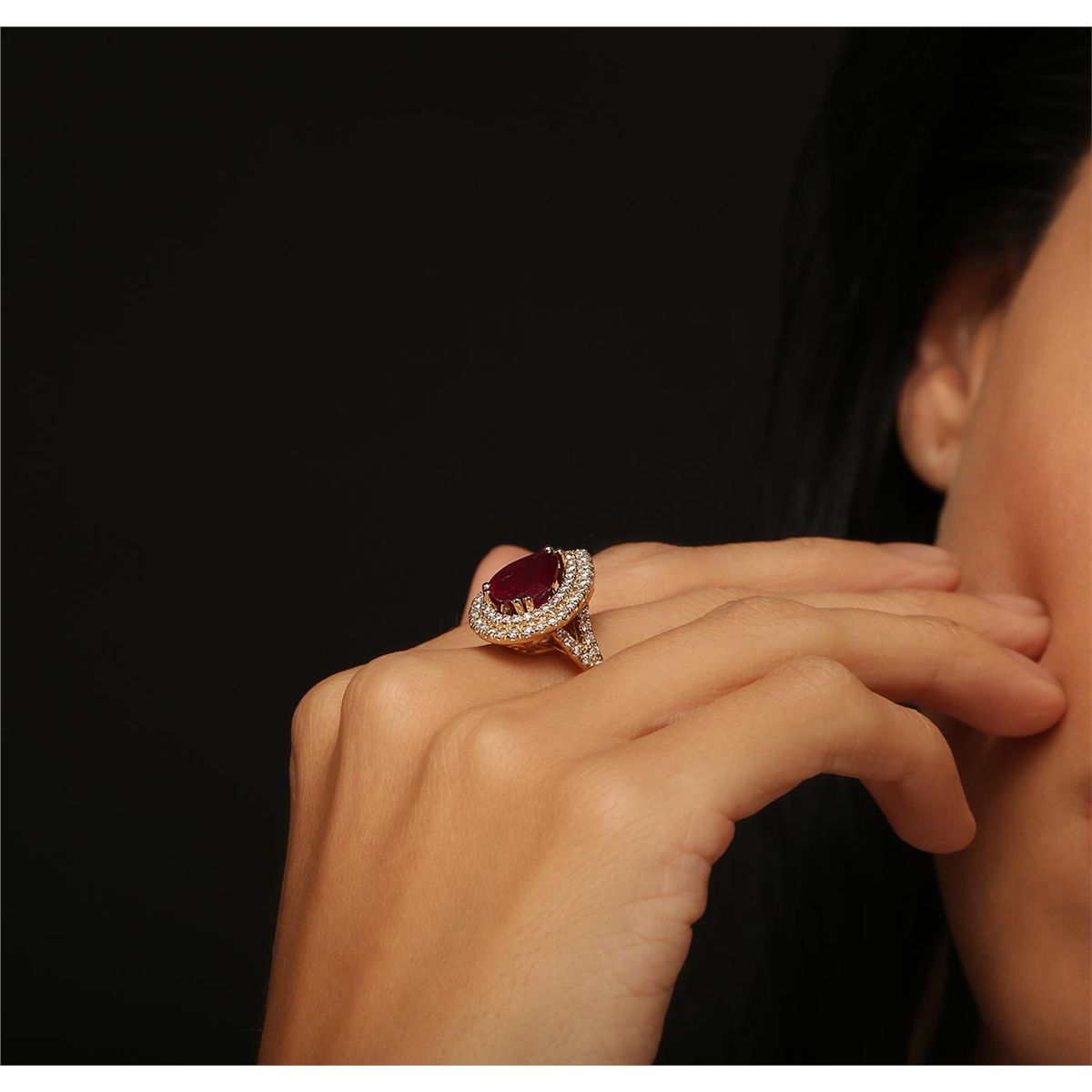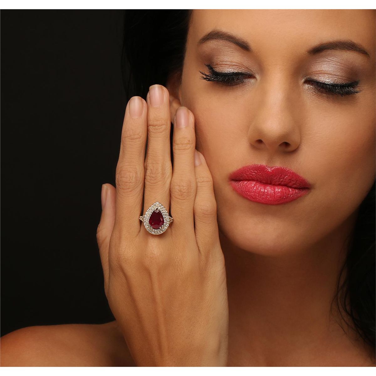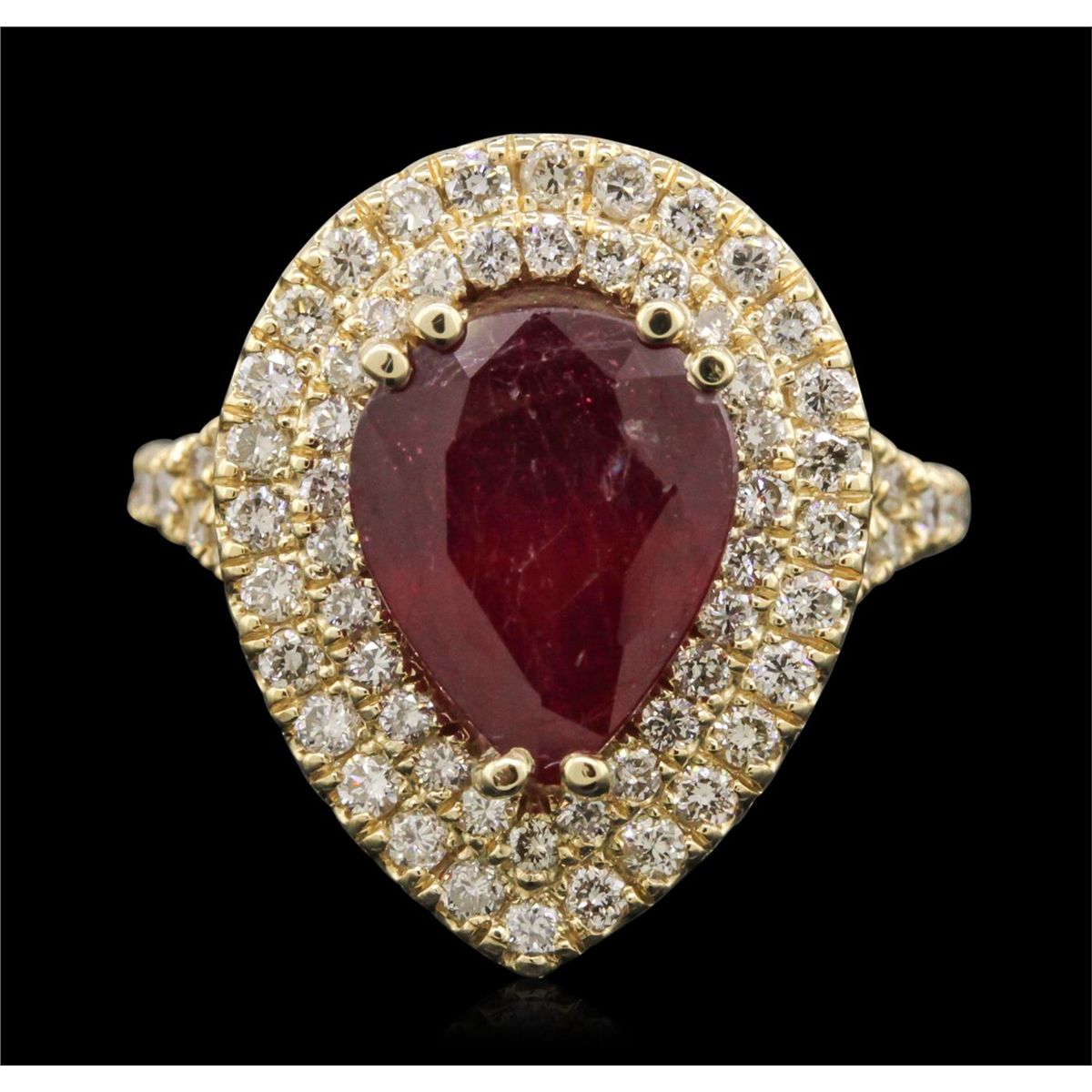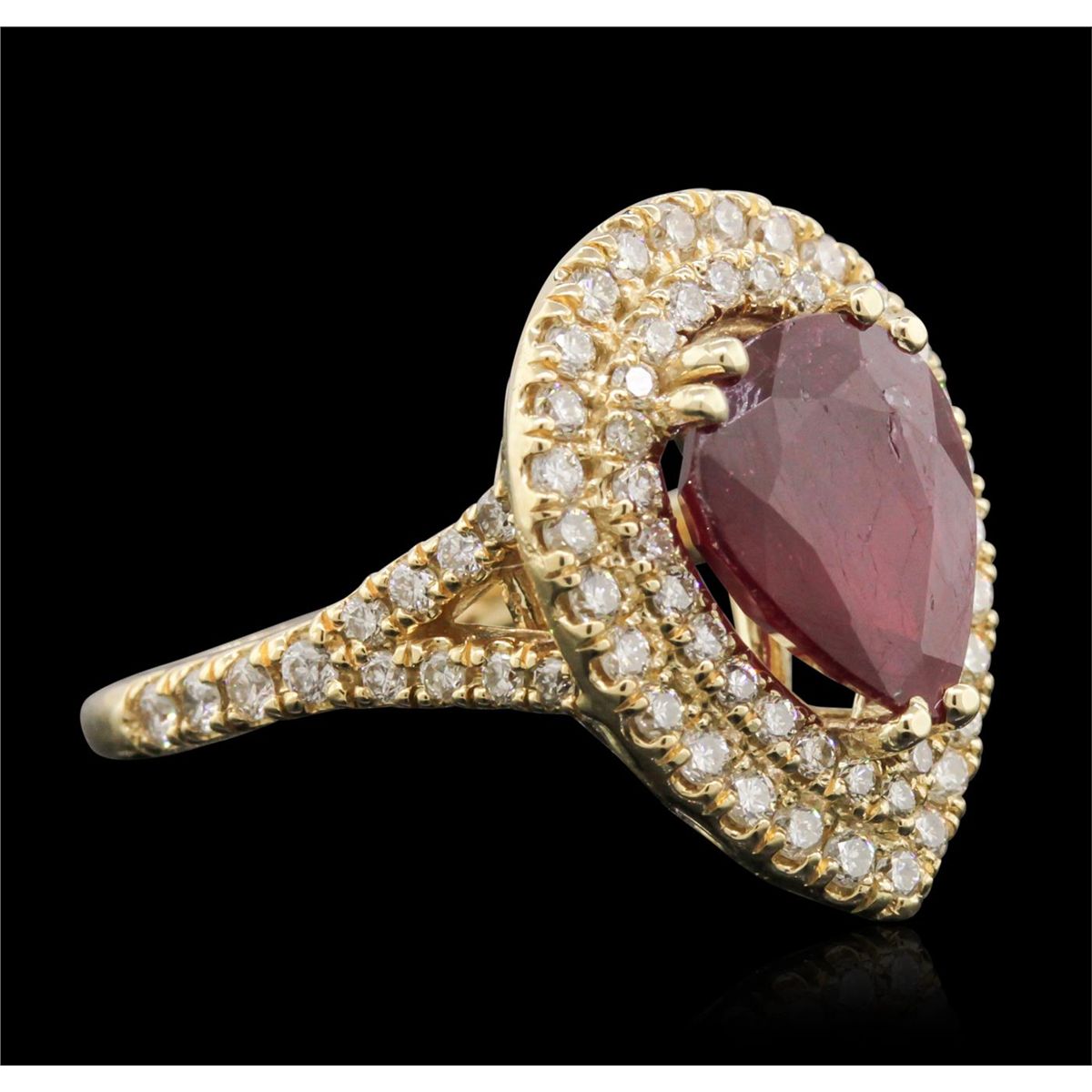 One electronically tested 14KT yellow gold Ladies combination cast & assembled ring with a bright polish finish. Condition is new. Identified with markings of "14K". Containing: One prong set pear modified brilliant cut natural ruby, measuring 10.90 x 8.94 x 5.50mm, approximate. Total Weight of 4.29ct., clarity is heavily included, type II, medium dark, moderately strong, strongly purplish red color, (GIA stpR 6/4), cut is good. Seventy-Eight prong set round brilliant cut diamonds, measuring 1.70 - 1.70 x 1.02mm (depth est.) approximate. Total Weight of 78 Stones = 1.40ct. Clarity: SI-1 to I-1. Color: K - L, Cut is Good. Colored gemstones are presumed to have been subjected to commonly used enhancement processes. All diamonds and colored gemstones are graded in the mounting, unless otherwise stated. Total Weight of Colored Stones 4.29ct. Total Weight of Diamonds 1.40ct. Total Weight of Ring 7.60 grams. GGL Appraised at $5,865.00.