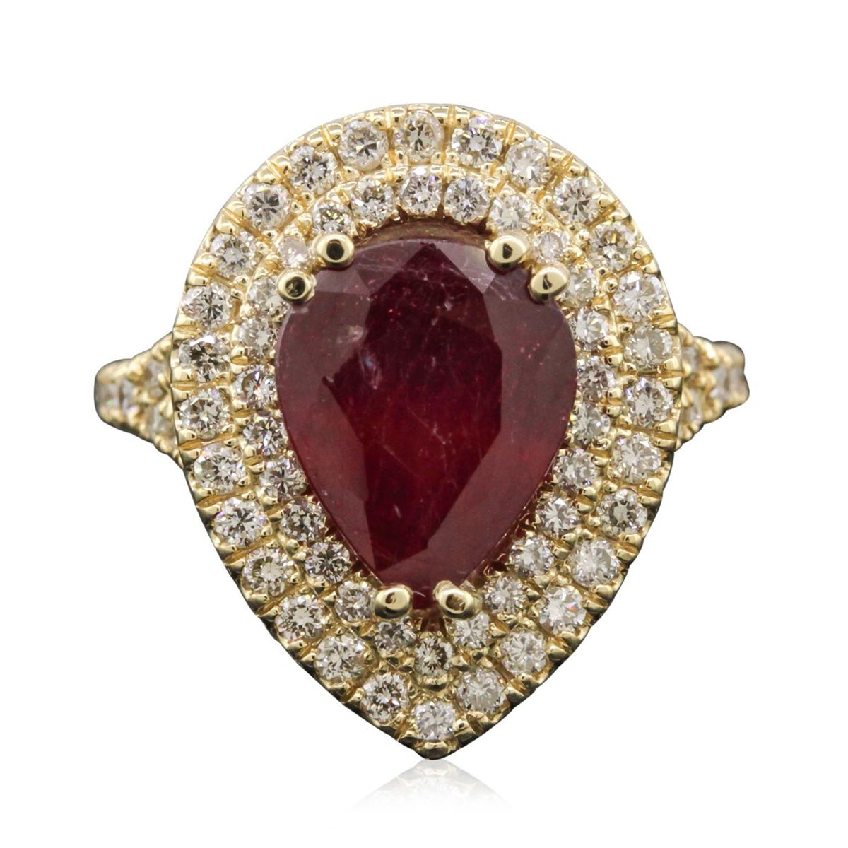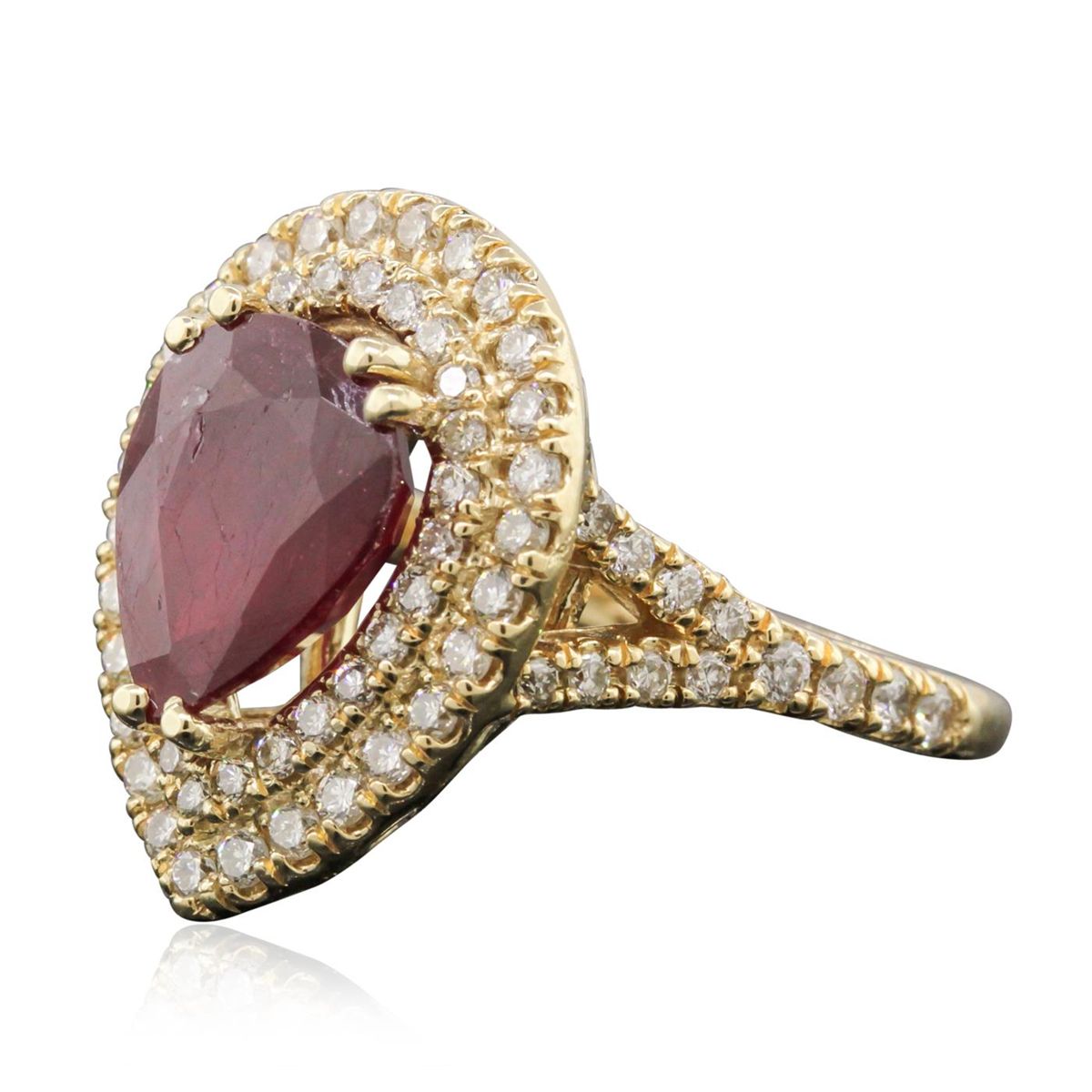 One electronically tested 14KT yellow gold Ladies combination cast & assembled ring with a bright polish finish. Condition is new. Identified with markings of "14K". Containing: One prong set pear modified brilliant cut natural ruby, measuring 10.90 x 8.94 x 5.50mm, approximate. Total Weight of 4.29ct., clarity is heavily included, type II, medium dark, moderately strong, strongly purplish red color, (GIA stpR 6/4), cut is good. Seventy-Eight prong set round brilliant cut diamonds, measuring 1.70 - 1.70 x 1.02mm (depth est.) approximate. Total Weight of 78 Stones = 1.40ct. Clarity: SI-1 to I-1. Color: K - L, Cut is Good. Colored gemstones are presumed to have been subjected to commonly used enhancement processes. All diamonds and colored gemstones are graded in the mounting, unless otherwise stated. Total Weight of Colored Stones 4.29ct. Total Weight of Diamonds 1.40ct. Total Weight of Ring 7.60 grams. GGL Appraised at $5,865.00.
