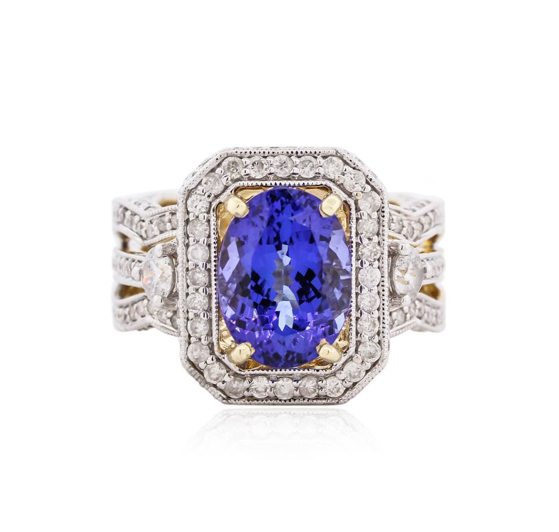 One electronically tested 14KT yellow gold ladies cast tanzanite and diamond ring. The featured tanzanite is set within a diamond lattice gallery, supported by diamond set shoulders and completed by a nine millimeter wide band. Trademark is Orianne. Identified with markings of "14K". Condition is new, good workmanship. Containing: One prong set oval mixed cut natural tanzanite, measuring 11.40 x 8.40 x 6.20mm, 6% bulge factor, approximate weight of 4.31ct., clarity is eye clean, type I, medium dark, moderately strong, bluish violet color, (GIA bV 6/4), cut is good. Transmitting light with no distortion, transparent. Graded in the setting. Tanzanite is a very rare gemstone that is only found in the country of Tanzania. Originally discovered in 1967. Tiffany & Company, named the stone Tanzanite. It is found in the Usumburu Mountains that border the Umba Valley of northern Tanzania. Tanzanite occurs in gray, brown, violet, blue, reddish-purple, & green. The gem is interesting because of its exceptional pleochroism. Rotated in different directions a tanzanite will exhibit multiple changes of color. Tanzanite has a low tolerance to ultrasonic cleaning, and should not be cleaned using this method. Numerous prong & bead set round brilliant cut diamonds, measuring 3.60 - 1.10 x 1.41 mm (depth est.) approximate total weight of the Stones = 2.13ct. Graded in the setting. Clarity: I-1 to I-3. Color: G - I. Total Weight of Colored Stones: 4.31ct. Total Weight of Diamonds: 2.13ct. Total Weight of Ring: 9.80gm. AIG Appraised at $18,160.00.