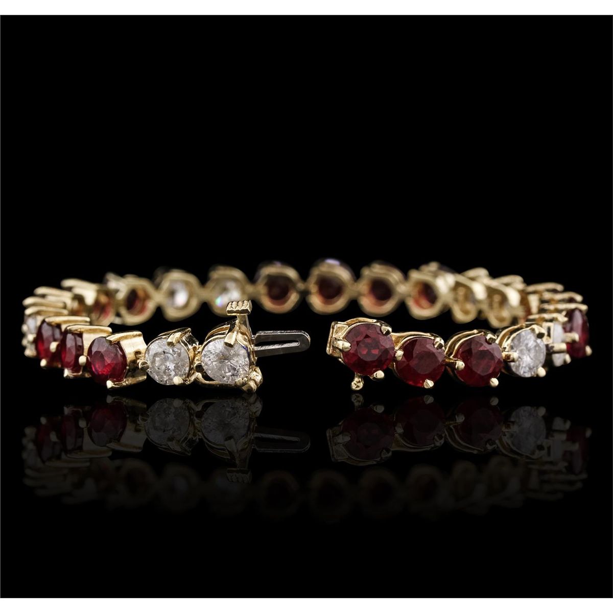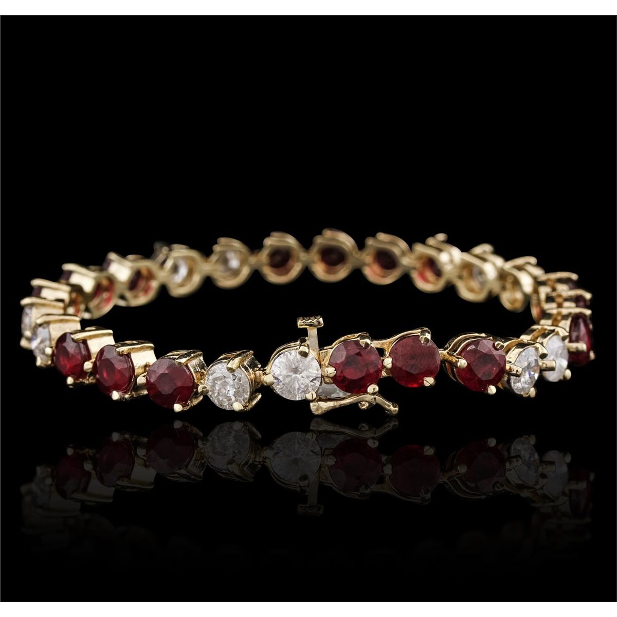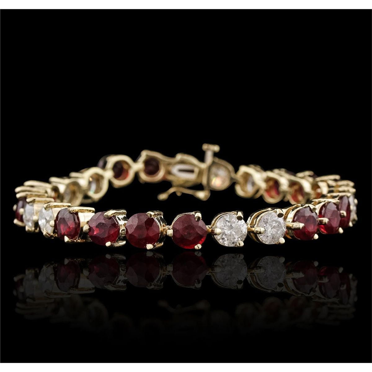 One electronically tested 14KT yellow gold ladies cast bracelet with a hidden box clap with a bright polish finish. Measurements: 7" in length Identified with markings of "14K". Condition is new. Containing: Sixteen prong set round modified brilliant cut natural rubies, measuring 5.90 - 5.90 x 3.84 mm, approximate total weight of 4.32ct., clarity is heavily included, medium dark, moderately strong, strongly purplish red color, (GIA stpR 6/4), cut is good. Ten prong set round brilliant cut diamonds, measuring 5.50 - 5.50 x 3.30mm (depth est.) approximate total weight of 10 Stones = 6.09ct. Clarity: I-1 to I-3. Color: H - I, Cut is Good. Colored gemstones are presumed to have been subjected to commonly used enhancement processes. All diamonds and colored gemstones are graded in the mounting, unless otherwise stated. Total Weight of Colored Stones 4.32ct. Total Weight of Diamonds 6.09ct. Total Weight of Ring 22.10 grams. GGL Appraised at $36,275.00.