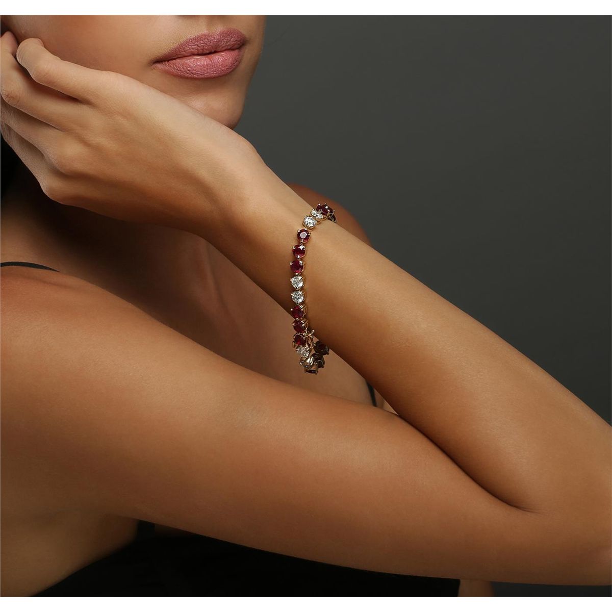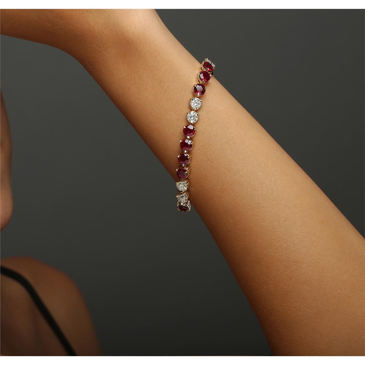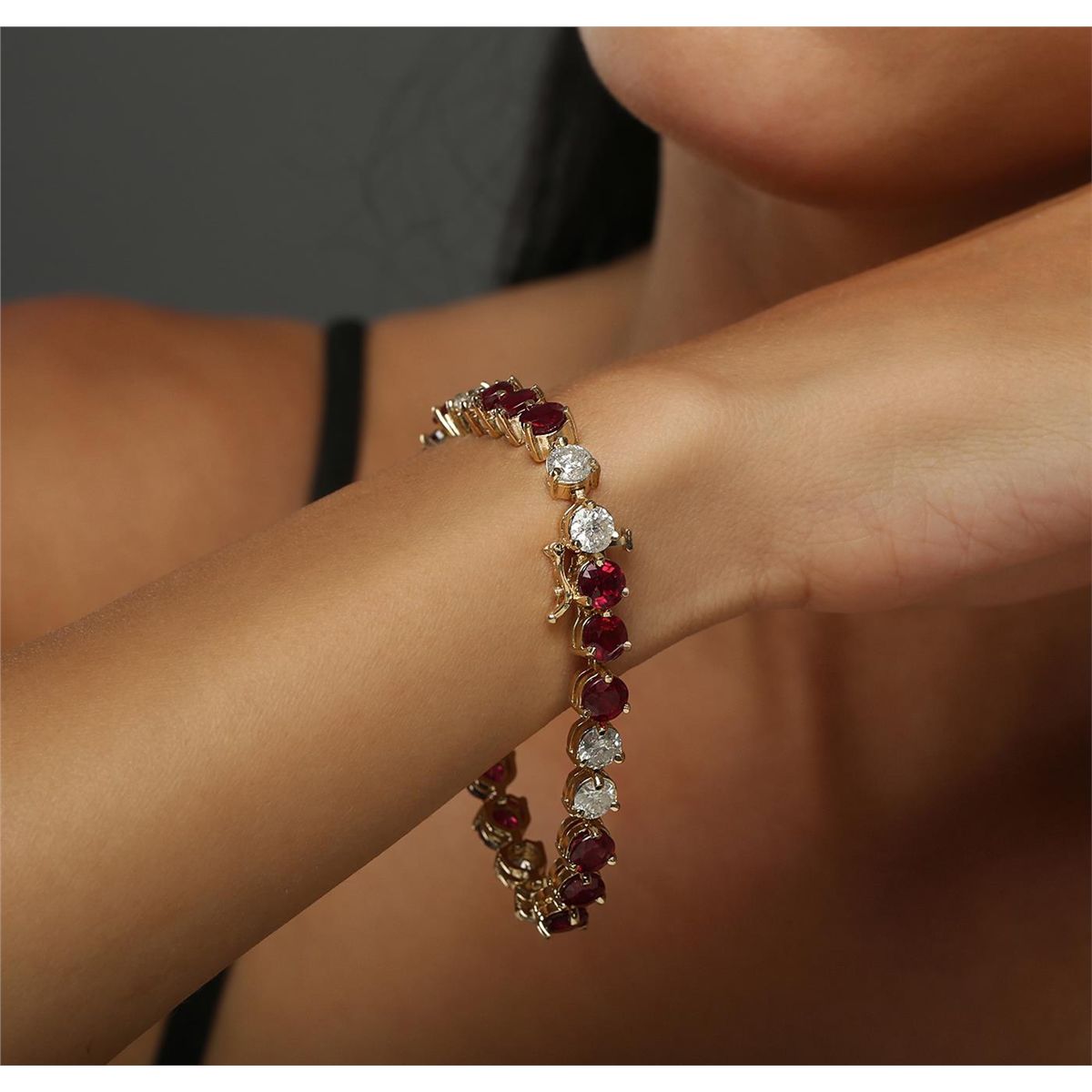 One electronically tested 14KT yellow gold ladies cast bracelet with a hidden box clap with a bright polish finish. Measurements: 7" in length Identified with markings of "14K". Condition is new. Containing: Sixteen prong set round modified brilliant cut natural rubies, measuring 5.90 - 5.90 x 3.84 mm, approximate total weight of 4.32ct., clarity is heavily included, medium dark, moderately strong, strongly purplish red color, (GIA stpR 6/4), cut is good. Ten prong set round brilliant cut diamonds, measuring 5.50 - 5.50 x 3.30mm (depth est.) approximate total weight of 10 Stones = 6.09ct. Clarity: I-1 to I-3. Color: H - I, Cut is Good. Colored gemstones are presumed to have been subjected to commonly used enhancement processes. All diamonds and colored gemstones are graded in the mounting, unless otherwise stated. Total Weight of Colored Stones 4.32ct. Total Weight of Diamonds 6.09ct. Total Weight of Ring 22.10 grams. GGL Appraised at $36,275.00.