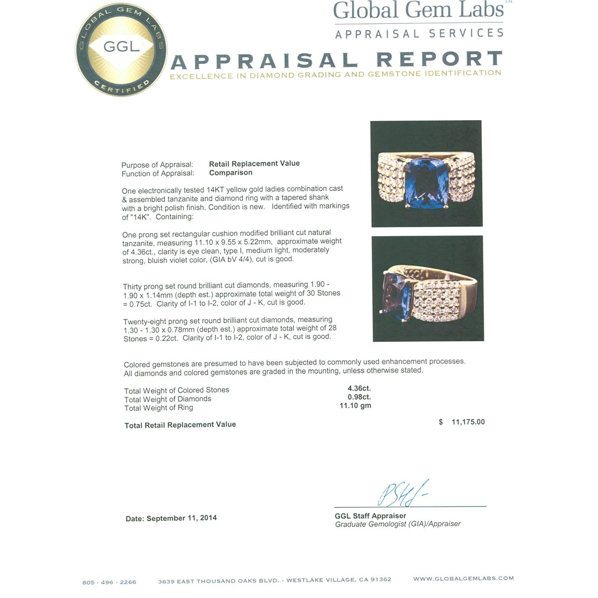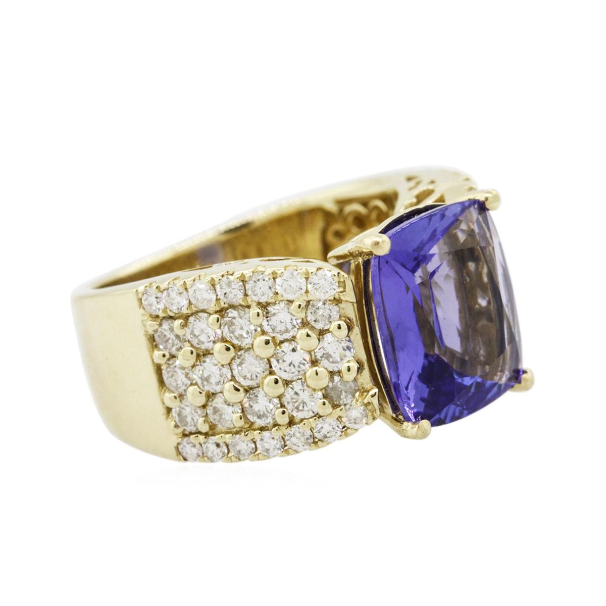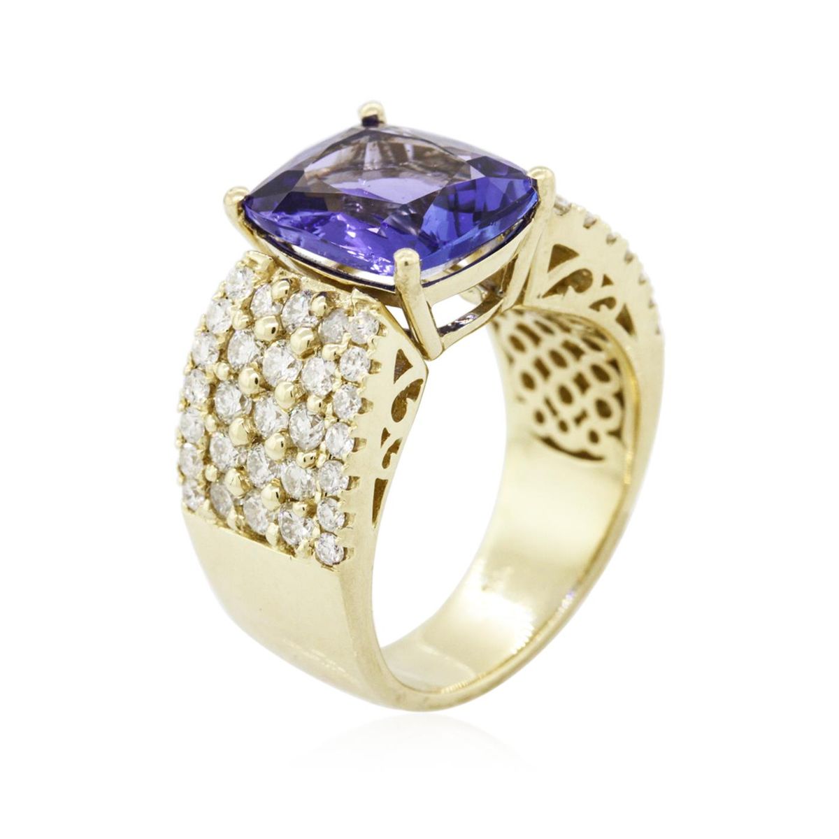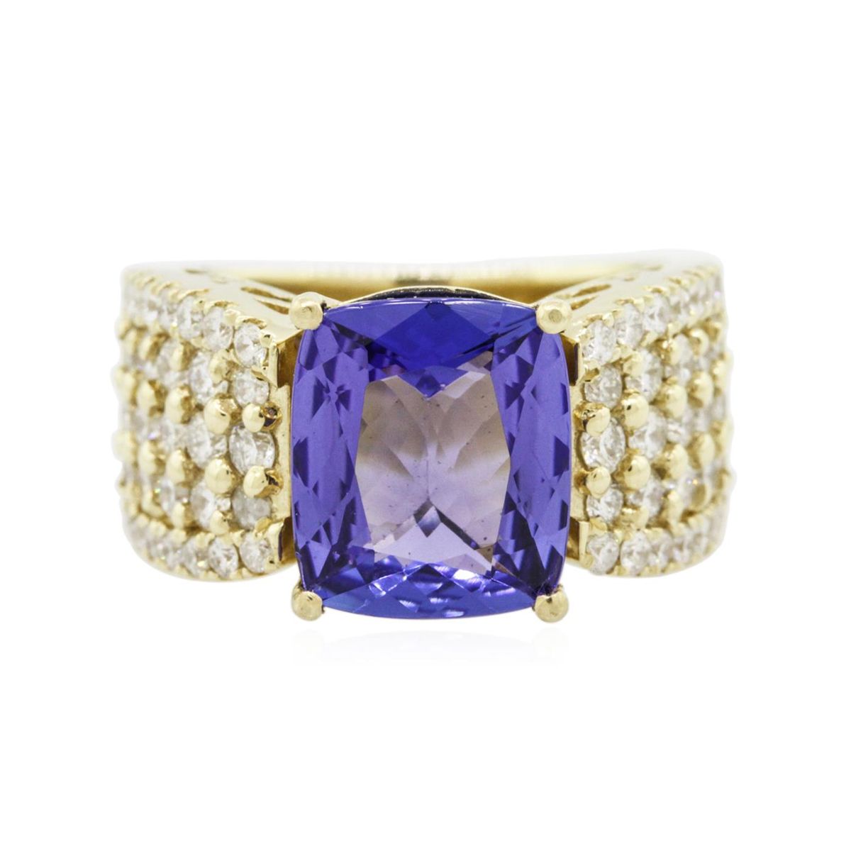 One electronically tested 14KT yellow gold ladies combination cast & assembled tanzanite and diamond ring with a tapered shank with a bright polish finish. Identified with markings of "14K". Condition is new. Containing: One prong set rectangular cushion modified brilliant cut natural tanzanite, measuring 11.10 x 9.55 x 5.22mm, approximate weight of 4.36ct., clarity is eye clean, type I, medium light, moderately strong, bluish violet color, (GIA bV 4/4), cut is good. Thirty prong set round brilliant cut diamonds, measuring 1.90 - 1.90 x 1.14mm (depth est.) approximate total weight of 30 Stones = 0.75ct. Clarity: I-1 to I-2. Color: J - K, Cut is Good. Twenty-Eight prong set round brilliant cut diamonds, measuring 1.30 - 1.30 x 0.78mm (depth est.) approximate total weight of 28 Stones = 0.22ct. Clarity: I-1 to I-2. Color: J - K, Cut is Good. Colored gemstones are presumed to have been subjected to commonly used enhancement processes. All diamonds and colored gemstones are graded in the mounting, unless otherwise stated. Total Weight of Colored Stones 4.36ct. Total Weight of Diamonds 0.98ct. Total Weight of Ring 11.10 grams. GGL Appraised at $11,175.00.