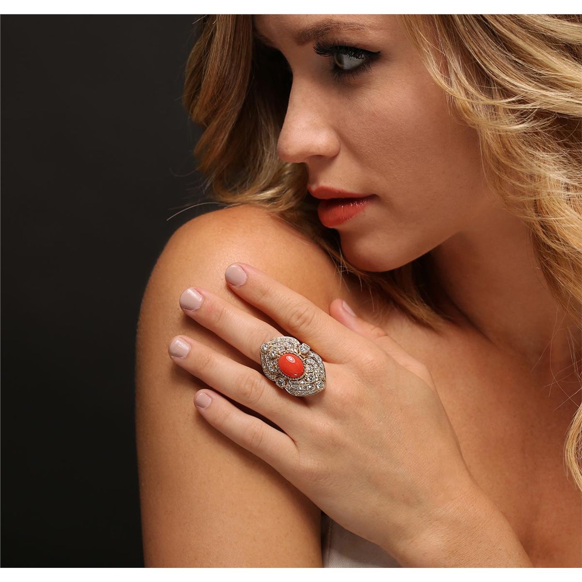 One electronically tested 14KT yellow gold Ladies combination cast & assembled fashion ring with a bright polish finish. Identified with markings of "14K". Condition is excellent. Containing: One prong set oval cabochon standard cut natural red coral, measuring 13.20 x 9.20 x 4.00mm, approximate weight of 4.40ct., clarity is severely included, medium, very slightly brownish, orangy red color, (GIA oR 5/3), cut is very good. Colored gemstones are presumed to have been subjected to commonly used and possible undetectable color/clarity enhancement processes. Six gypsy set round brilliant cut diamonds, measuring 3.50 - 3.50 x 2.10mm (depth est.) approximate total weight of 6 Stones = 0.98ct. Clarity of SI-2 to I-1, Color of F - G, Cut is Very Good. Forty-Eight bead set round brilliant cut diamonds, measuring 2.00 - 2.00 x 1.20mm (depth est.) approximate total weight of 48 Stones = 1.54ct. Clarity of SI-1 to I-1, Color of F - G, Cut is Very Good. Total Weight of Colored Stones 4.40ct. Total Weight of Diamonds 2.52ct. Total Weight of Ring 11.70gm. GGL Appraised at $11,390.00.