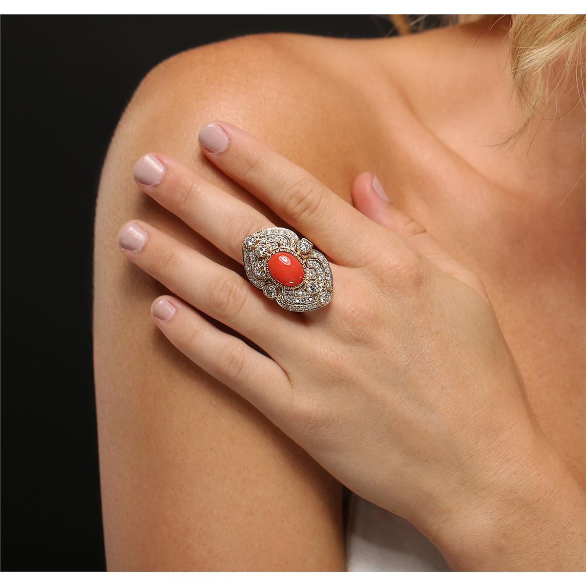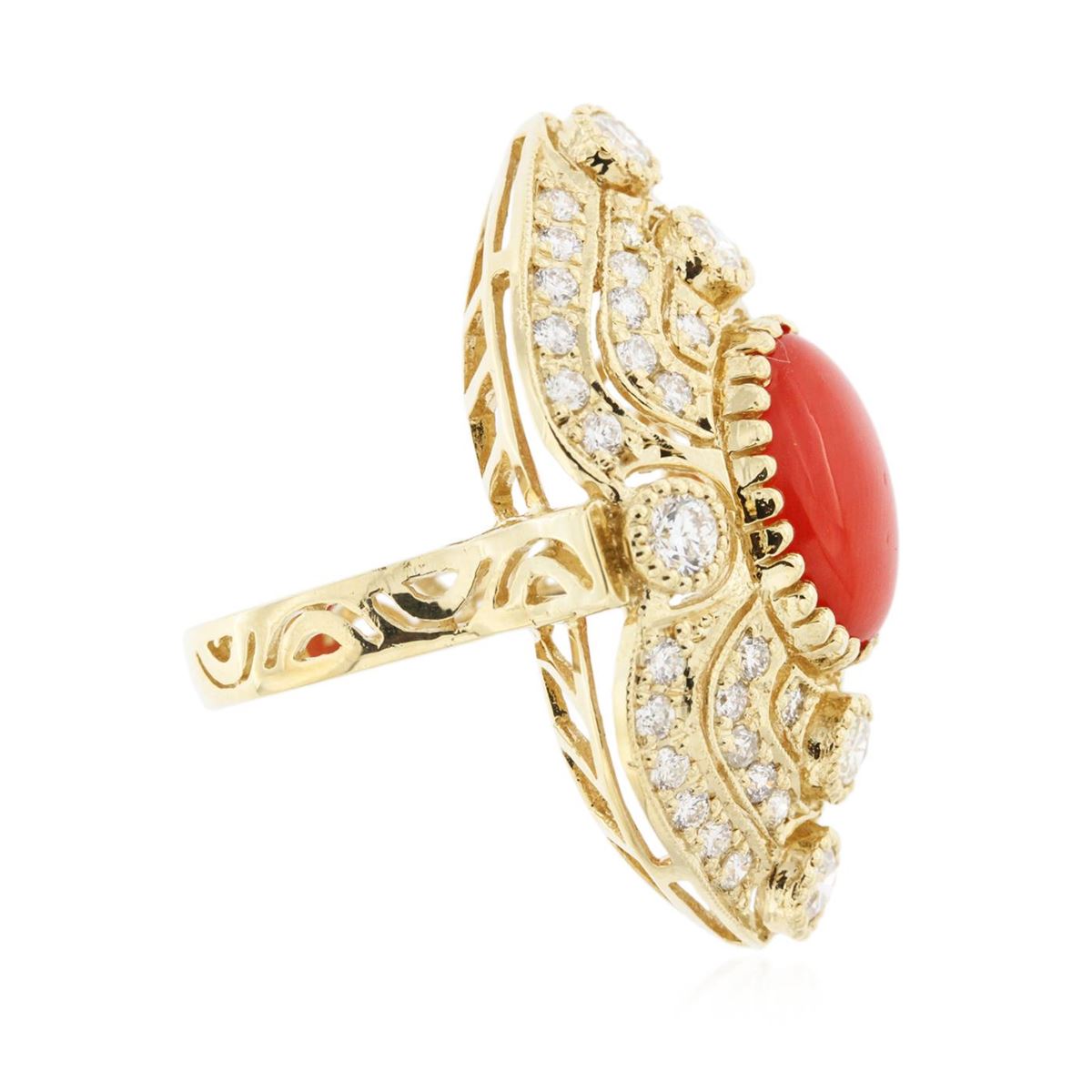 One electronically tested 14KT yellow gold Ladies combination cast & assembled fashion ring with a bright polish finish. Identified with markings of "14K". Condition is excellent. Containing: One prong set oval cabochon standard cut natural red coral, measuring 13.20 x 9.20 x 4.00mm, approximate weight of 4.40ct., clarity is severely included, medium, very slightly brownish, orangy red color, (GIA oR 5/3), cut is very good. Colored gemstones are presumed to have been subjected to commonly used and possible undetectable color/clarity enhancement processes. Six gypsy set round brilliant cut diamonds, measuring 3.50 - 3.50 x 2.10mm (depth est.) approximate total weight of 6 Stones = 0.98ct. Clarity of SI-2 to I-1, Color of F - G, Cut is Very Good. Forty-Eight bead set round brilliant cut diamonds, measuring 2.00 - 2.00 x 1.20mm (depth est.) approximate total weight of 48 Stones = 1.54ct. Clarity of SI-1 to I-1, Color of F - G, Cut is Very Good. Total Weight of Colored Stones 4.40ct. Total Weight of Diamonds 2.52ct. Total Weight of Ring 11.70gm. GGL Appraised at $11,390.00.